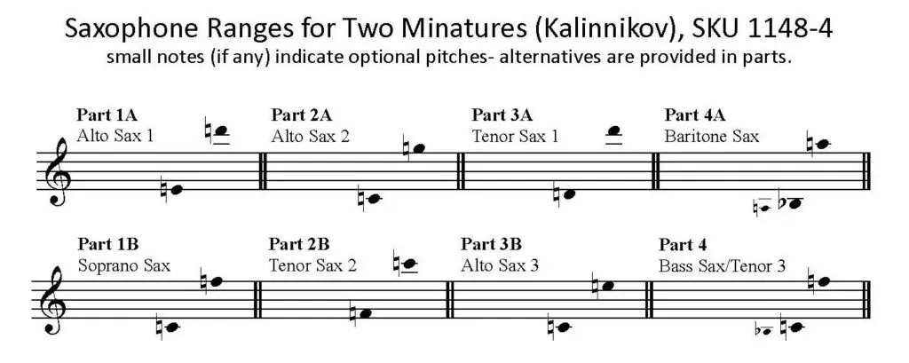 This arrangement of Two Miniatures is for saxophone quartet – variable scoring. The following parts are included: