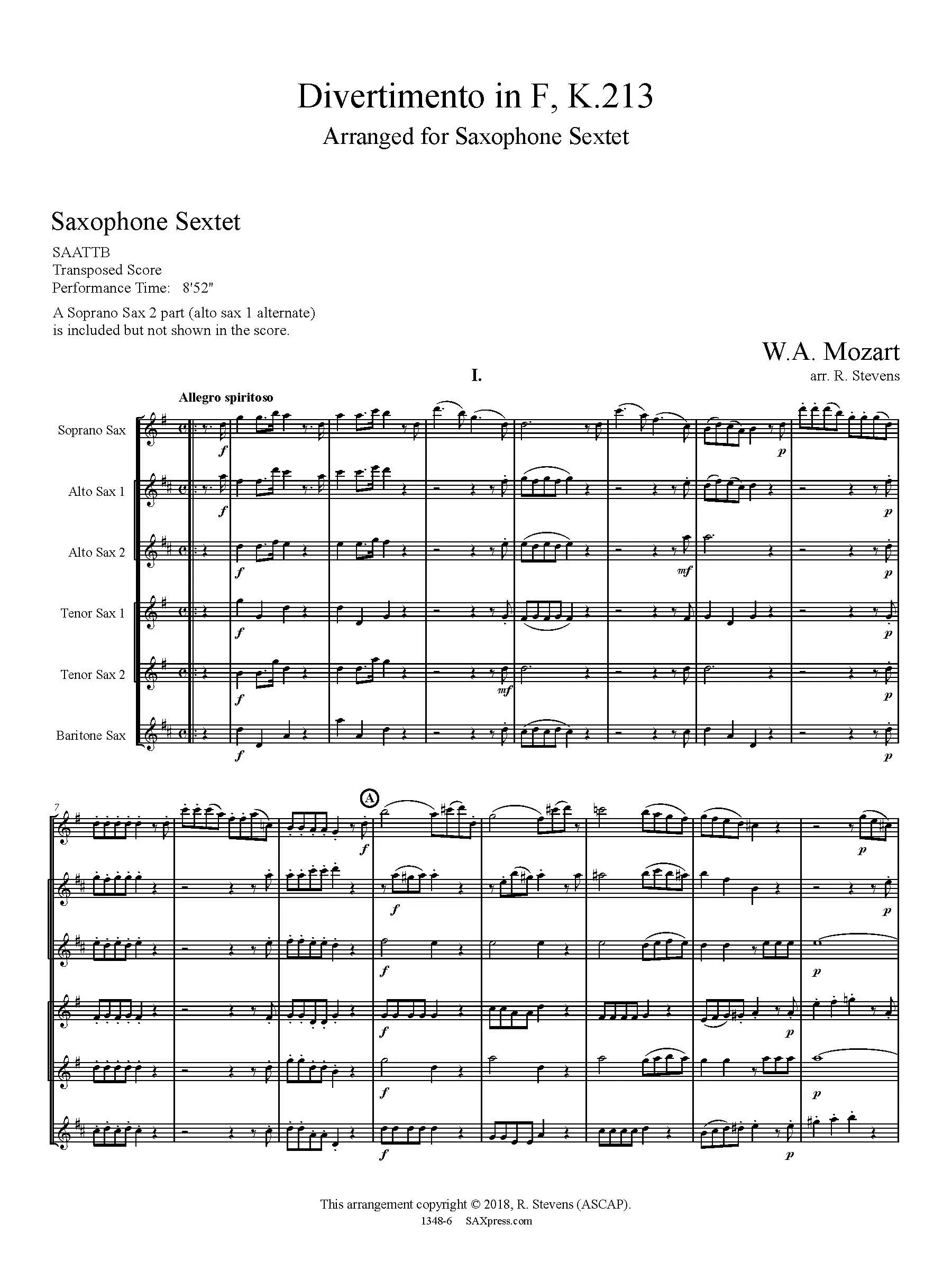 Divertimento in F major by Wolfgang Amadeus Mozart arranged for Saxophone Sextet SSATTBar or SAATTBar.