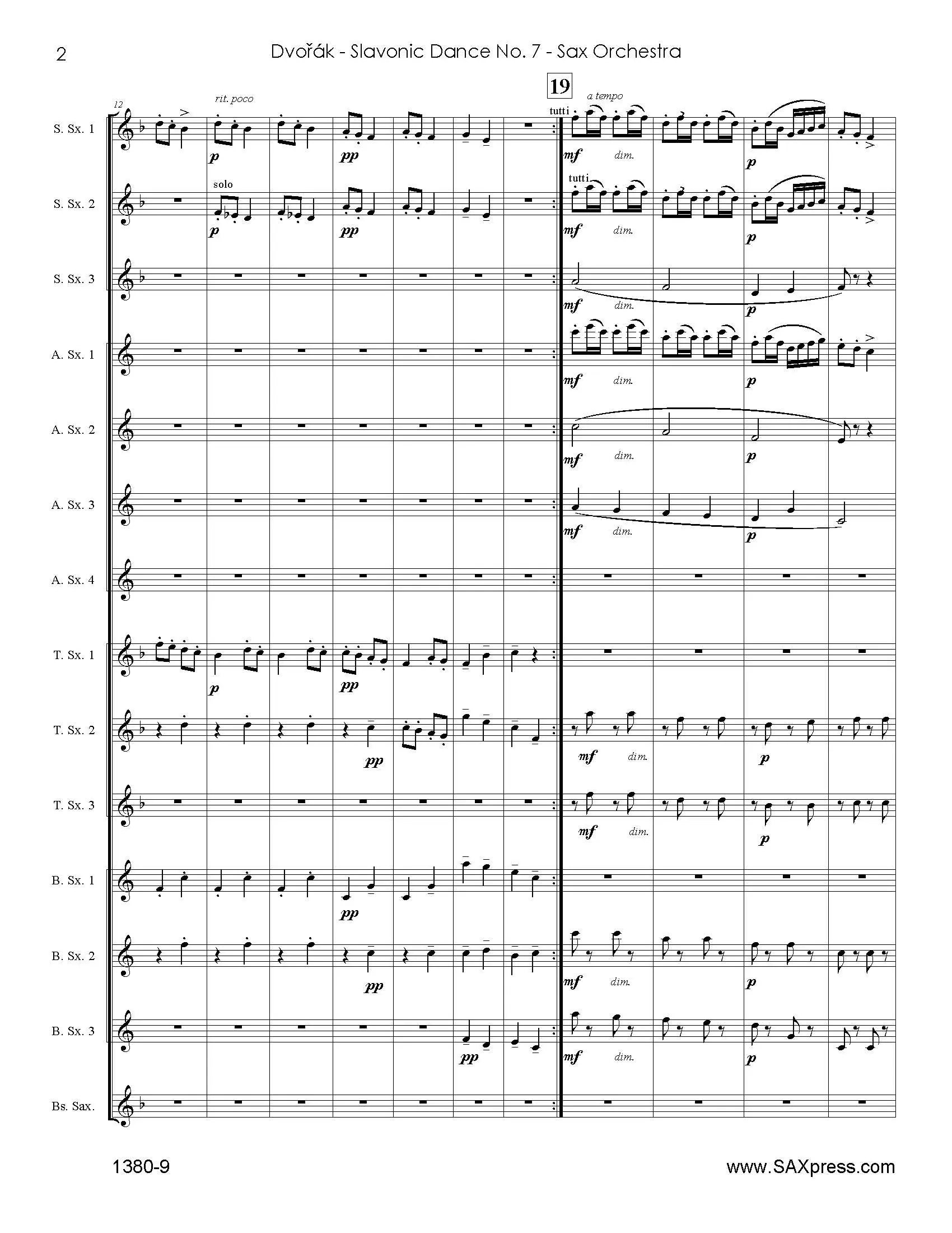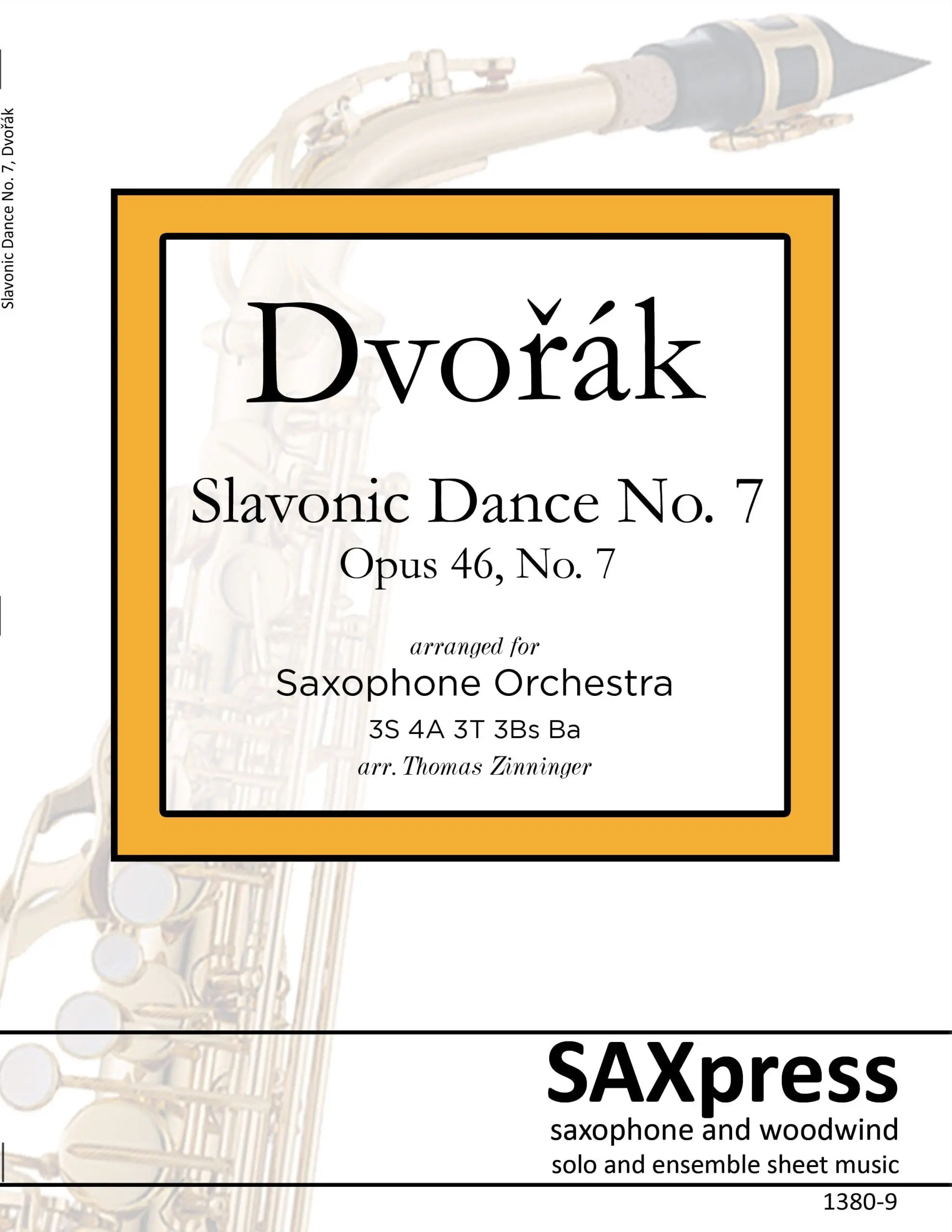 Slavonic Dance No. 7 by Antonin Dvorak arranged for Saxophone Orchestra. Originally composed for piano four hands, Dvořák’s Slavonic Dances, Op. 46 are a set of short pieces written between 1878 and 1886. The best known versions of the works were adapted by Dvořák for symphony orchestra shortly after their original publication. This arrangement brings Slavonic Dance No. 7 “Skočná” to the large saxophone ensemble. Like many of the other Slavonic Dances, the work is loosely set in rondo form with a main theme in C minor and contrasting themes in major keys. The canonic primary theme is first introduced by a soprano-tenor saxophone duet before being passed around to various other instrument groupings. Though set in a minor key, the composition is full of character and maintains a playful manner throughout. This arrangement is in the original key of C minor.