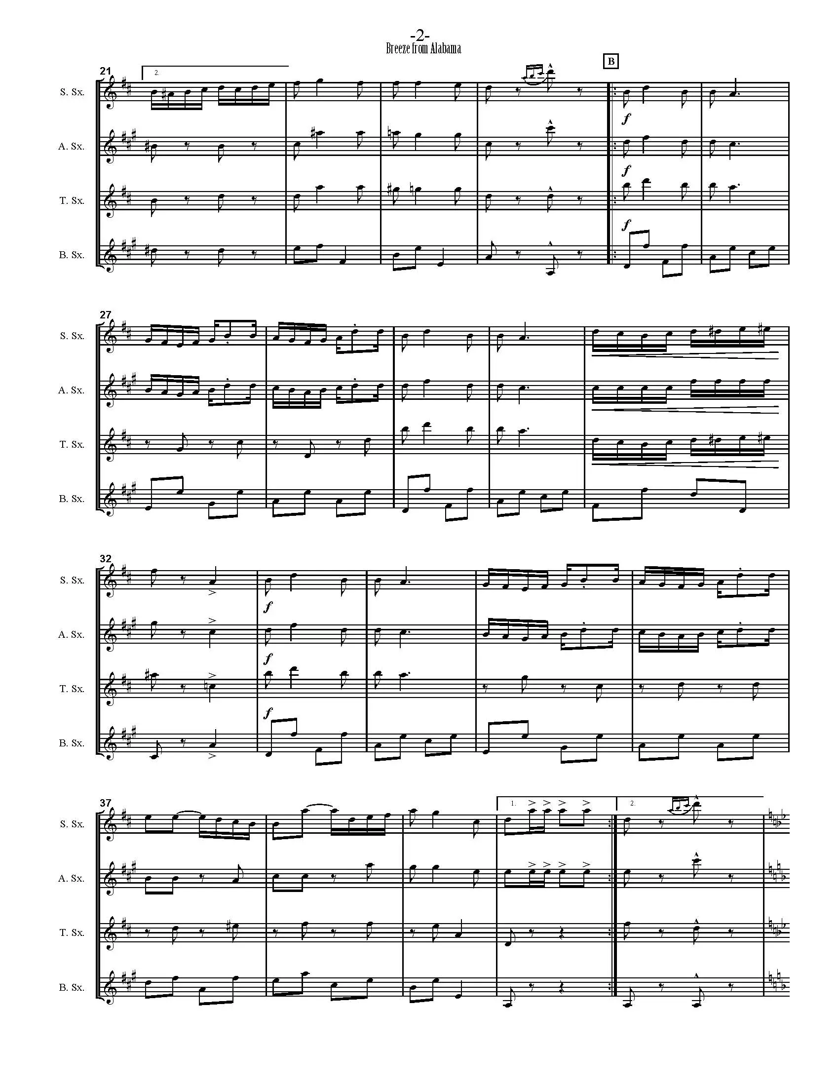 This S/AATB sax quartet transcription of A Breeze from Alabama is in the original keys. It uses the full range of the soprano and alto. The tenor and bari have a somewhat easier time of it.