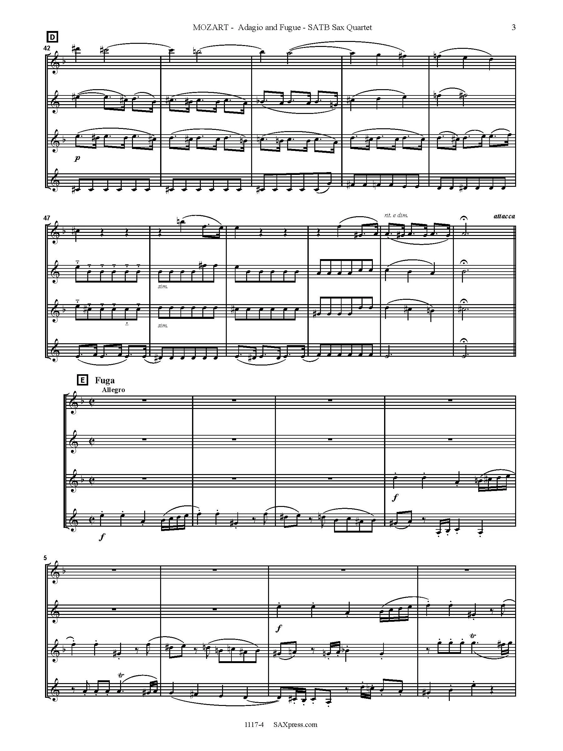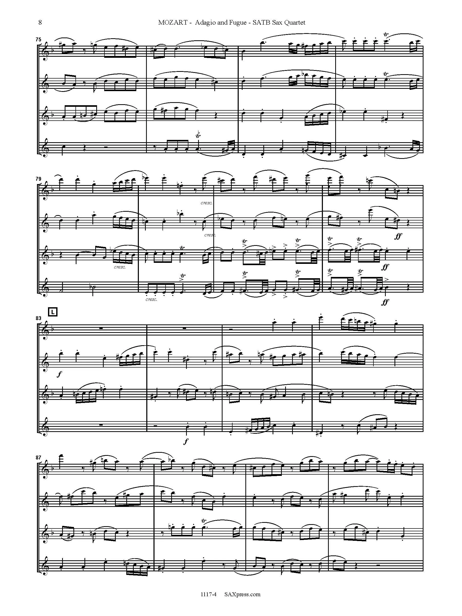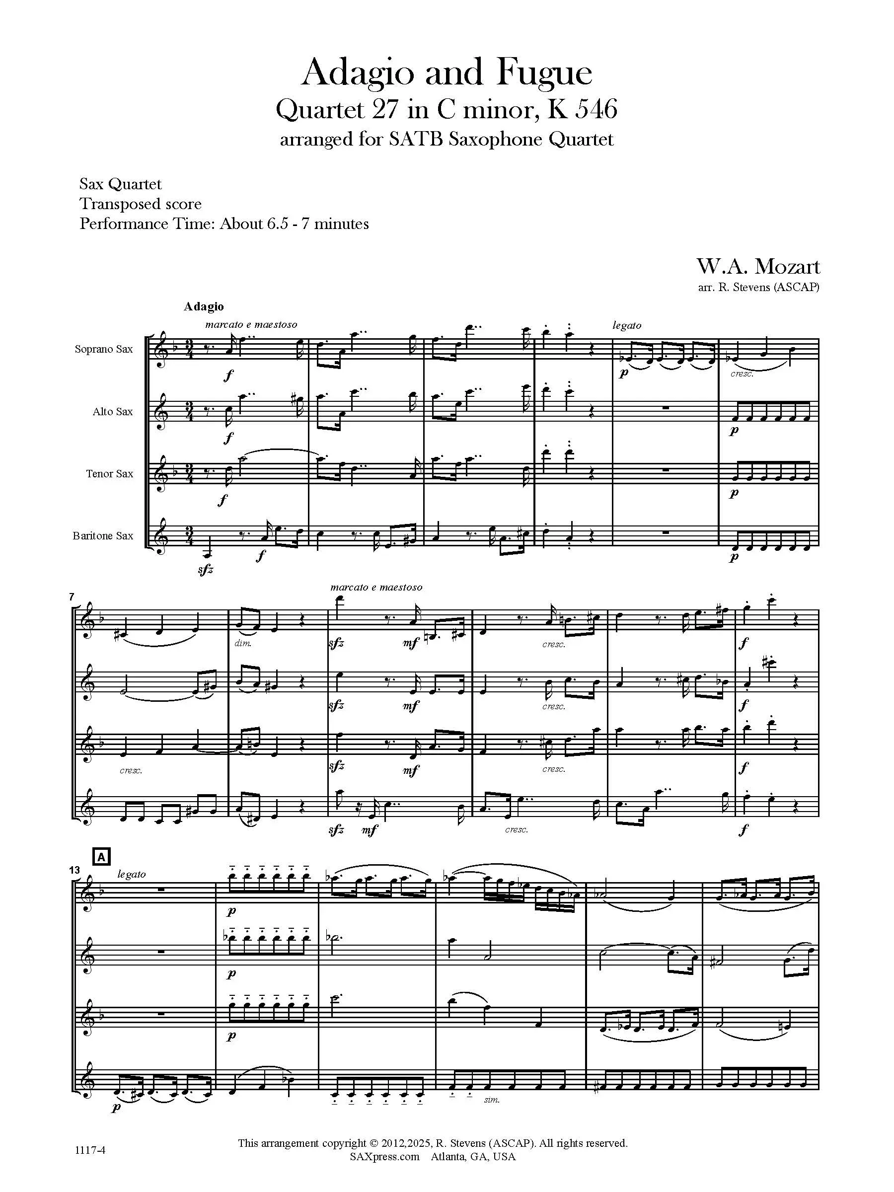 Adagio and Fugue in C minor, K546 by Mozart – string quartet transcription for saxophone quartet SATB. This is Mozart’s String Quartet, No. 27 arranged for SATB saxophone quartet. It is complete and in the original key of C minor. There are only two movements.