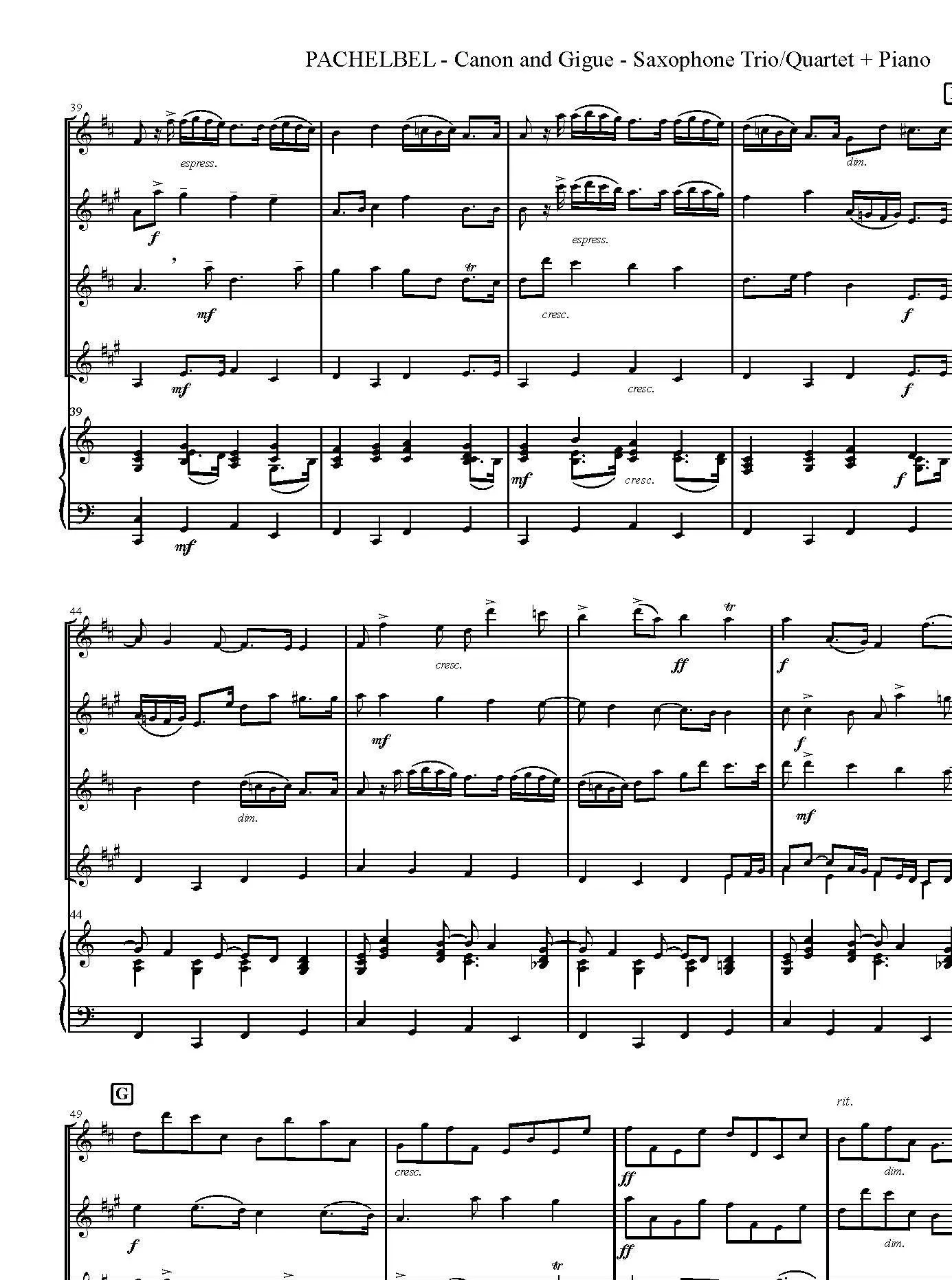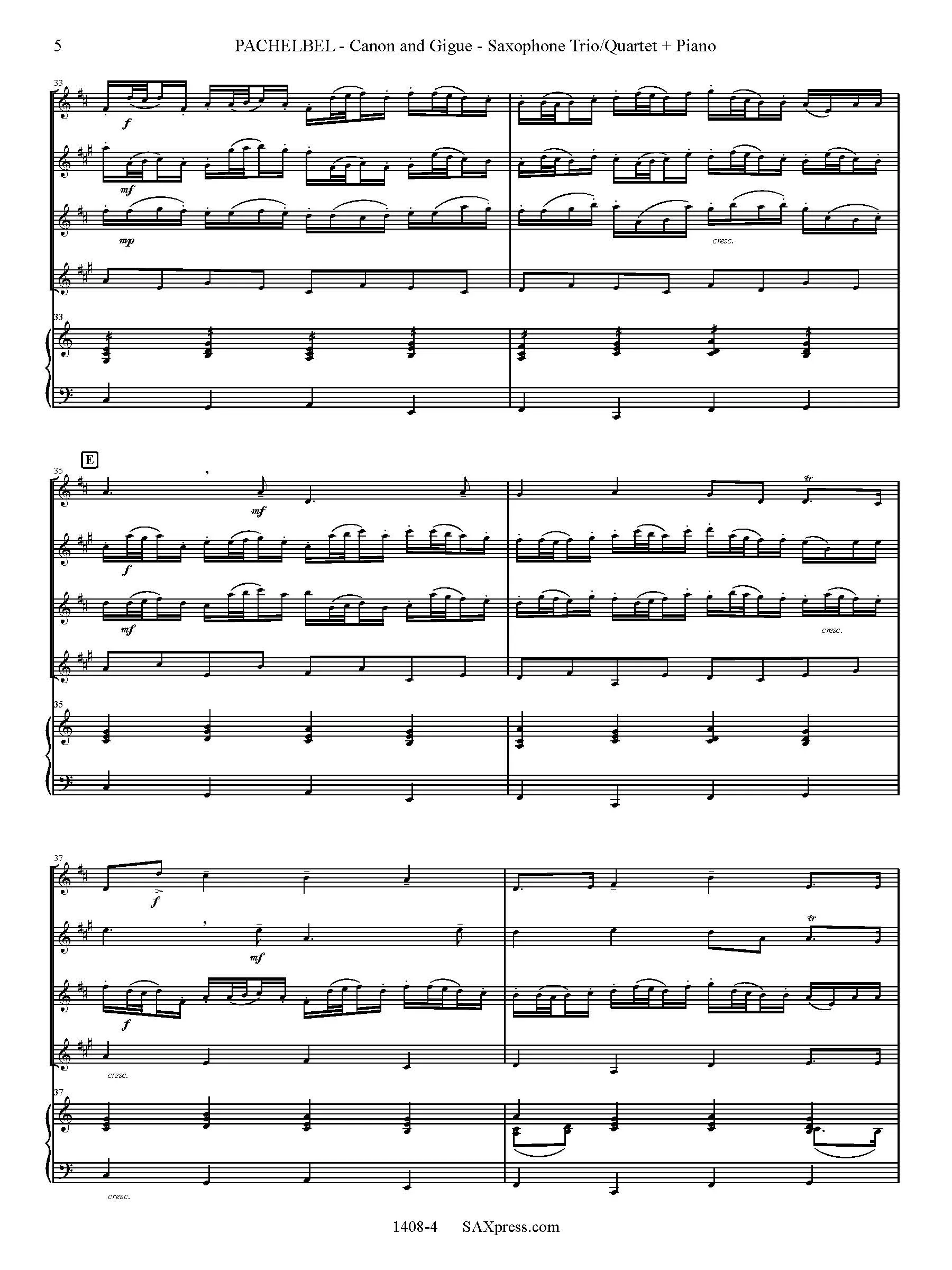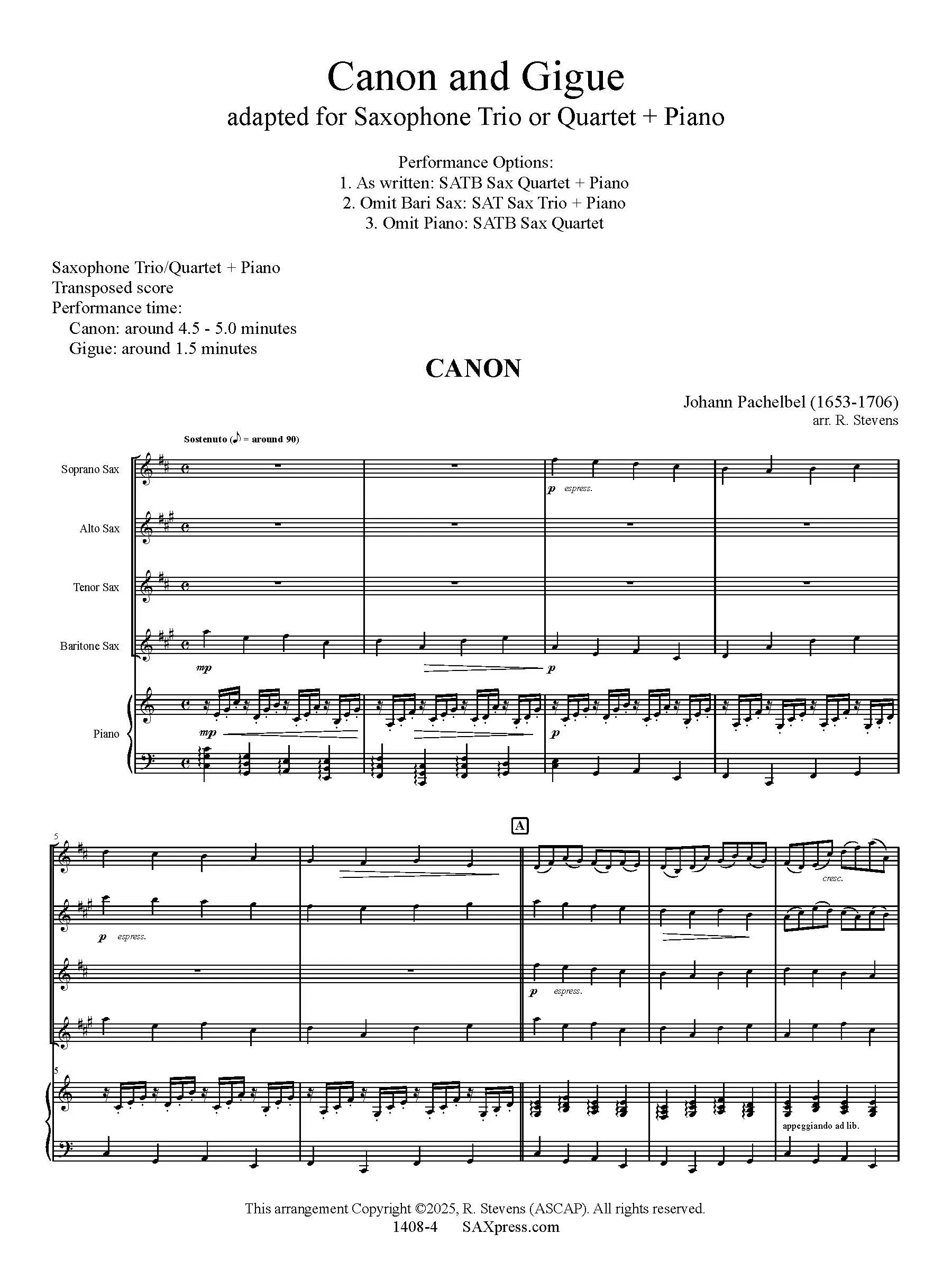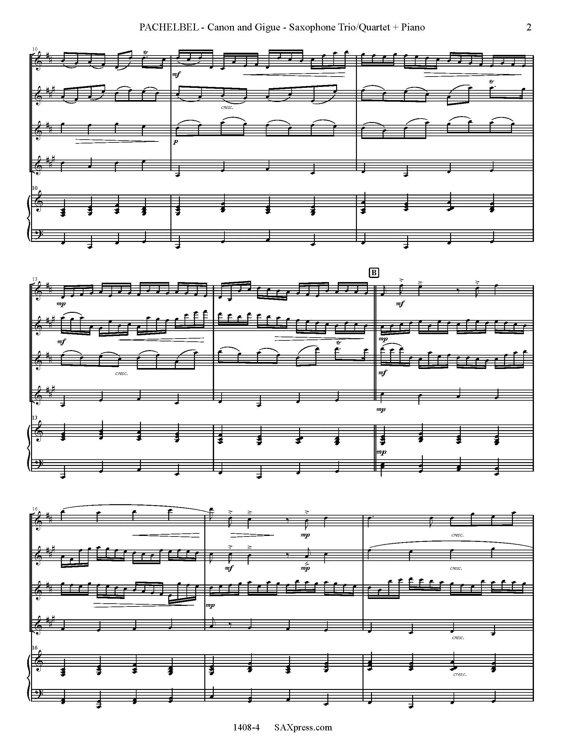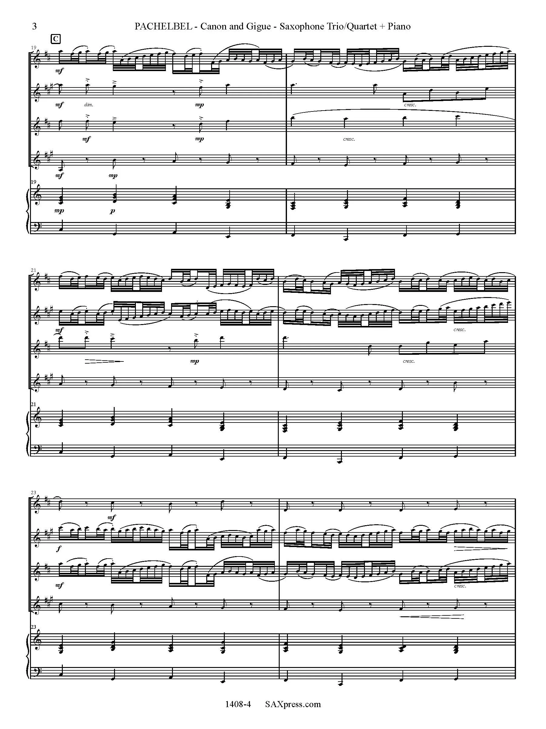 The original work is in the key of D and was written for three violins and basso continuo. This arrangement has been transposed to the key of C. Some octave transpositions have been made to accommodate saxophones. The Canon is in common time and is typically played at a slowish, graceful tempo. The Gigue is in 12/8. It is much less well-known. It is quite short and should go at a lively allegro tempo. The original work had no tempo, phrasing, expression, or dynamic markings. They have been added for your convenience but please, feel free to ignore or amend them to suit your performance. A certain amount of improvisation and ornamentation was expected of players during the Baroque era.