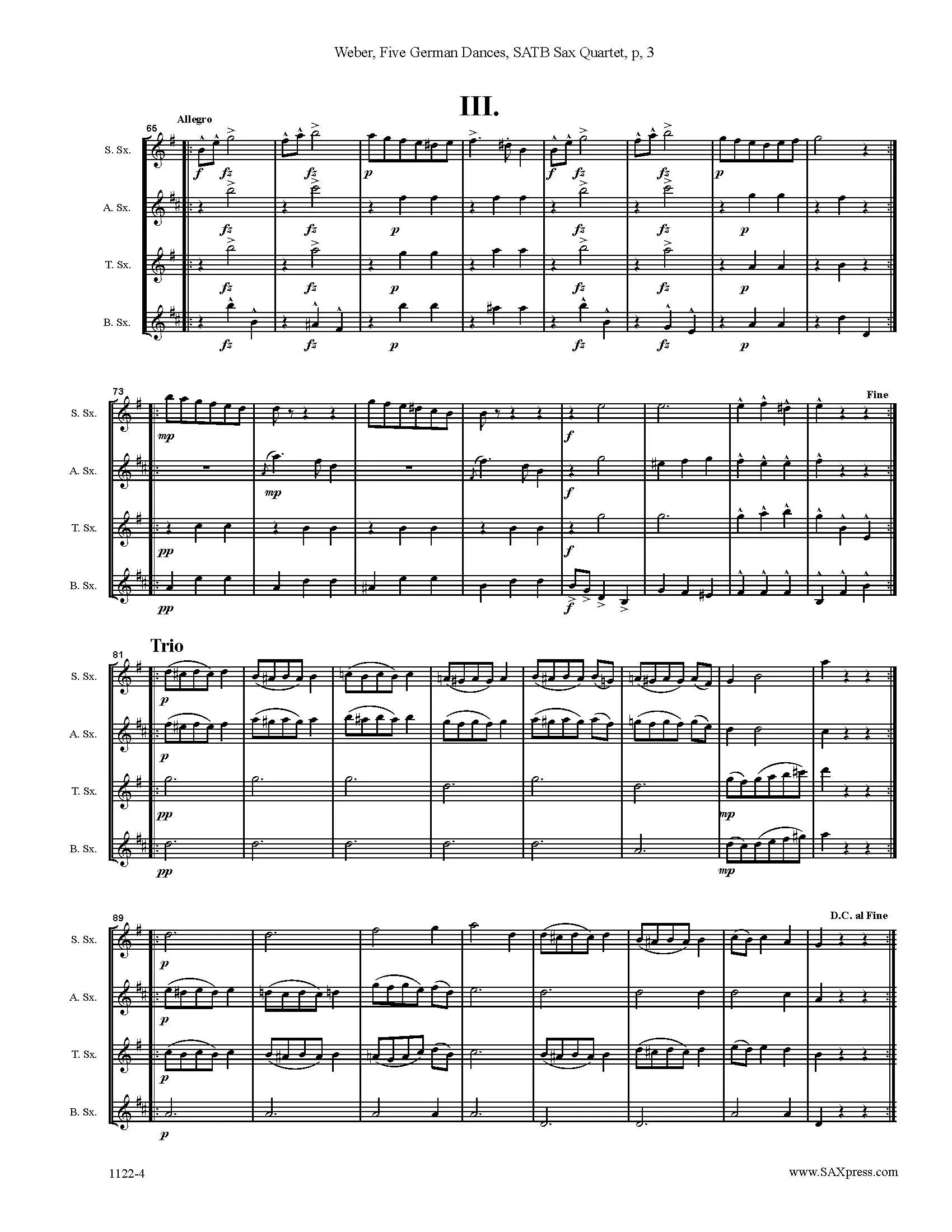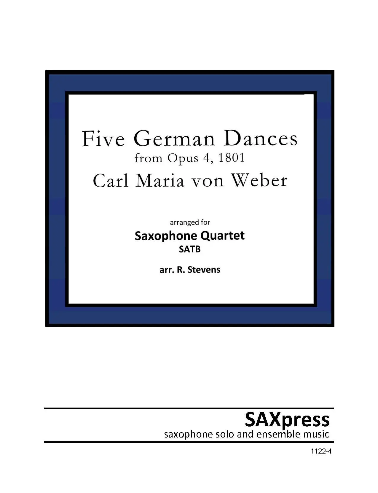 Five German Dances from Opus 4 by Carl Maria von Weber, arranged for saxophone quartet SATB. Written in the fall of 1801, these dances by Carl Maria von Weber are a charming set of pieces for the novice pianist. A German Dance or Allemande is in many ways an early ancestor of a waltz. These short pieces are good for young players as they, for the most part, have a limited range and are not too rhythmically complicated.