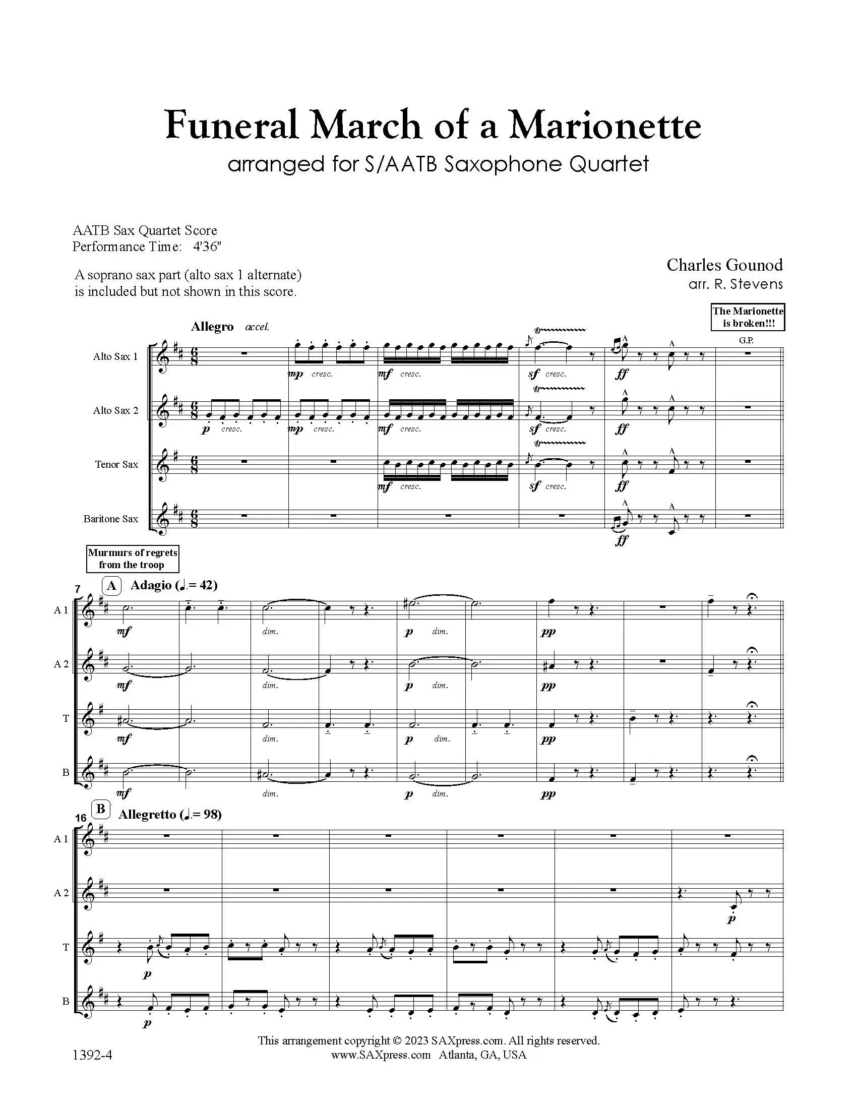Funeral March of a Marionette by Charles Gounod, arranged for S/AATB saxophone quartet. Funeral March of a Marionette (Marche funèbre d’une marionnette) is a well known piece by Charles Gounod. He wrote it in 1872 for solo piano and orchestrated it in 1879. The march has been used frequently in film and pop culture. It is best known as the theme for the American television program “Alfred Hitchcock Presents”, which originally aired from 1955 to 1965. It is an eerie but good humored little tune.
