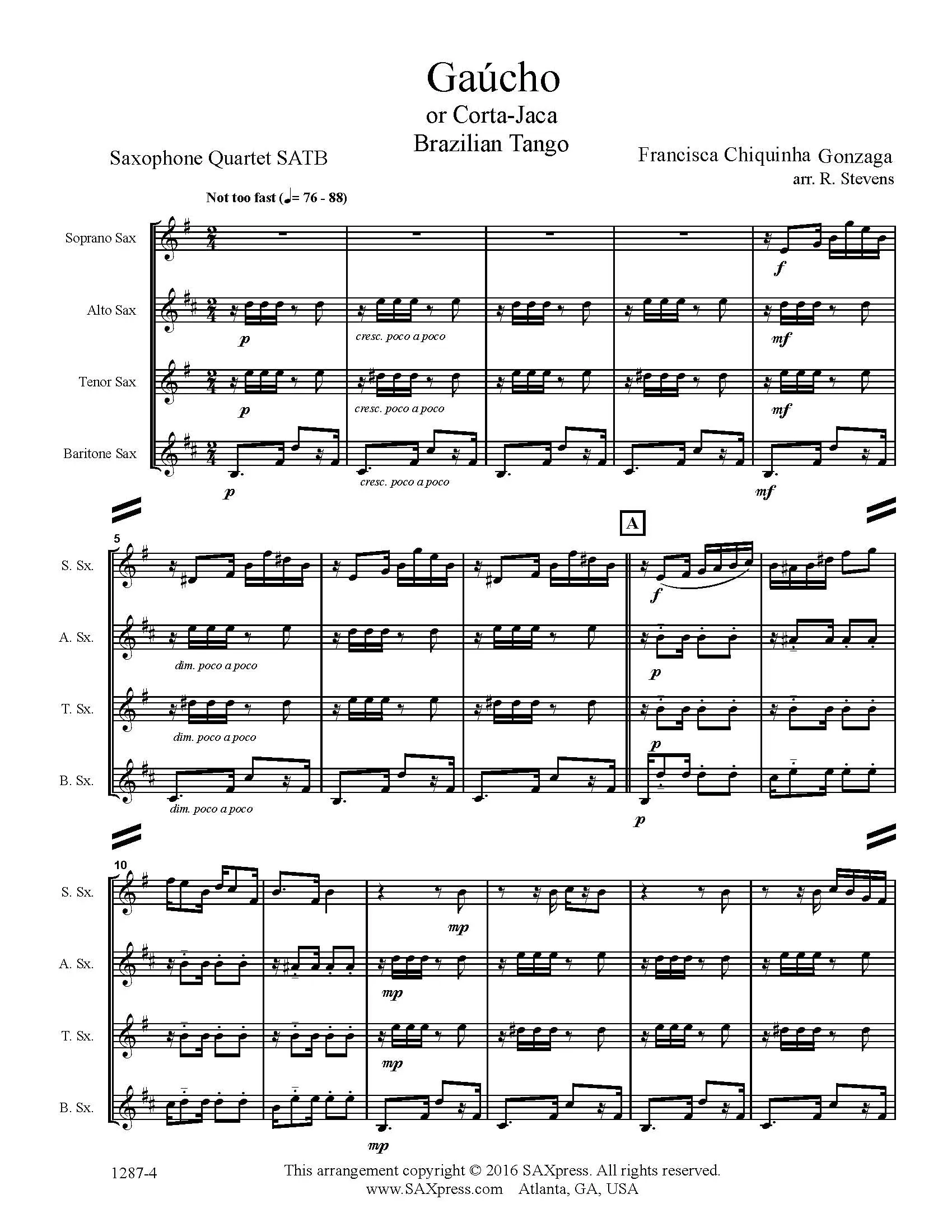 This arrangement of Gaucho/Corta Jaca is for SATB saxophone quartet and is in the original keys.