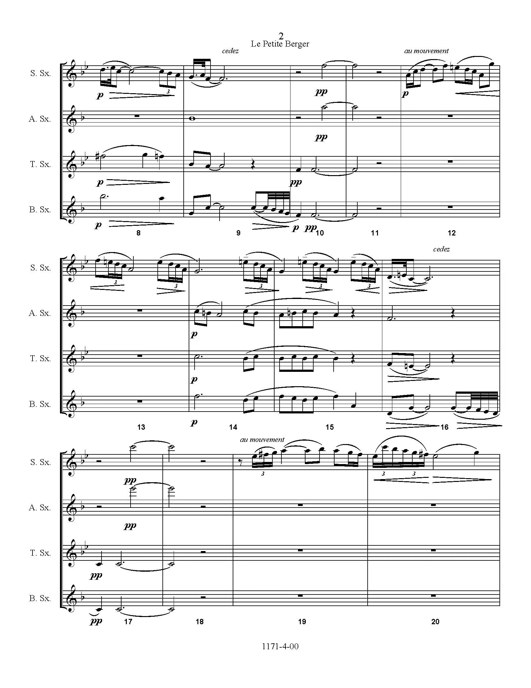 Le Petit Berger (The Little Shepherd) by Debussy arranged for saxophone quartet SATB. This is the fifth movement of a set of piano pieces entitled “The Children’s Corner” that Debussy wrote for his daughter. The shepherd in the piece seems sad and lonely as he improvises a melancholy tune on his pipe. Later a little dance-like motif is introduced. The shepherd’s pipe returns and alternates with the dance tune and then the piece quietly fades away.