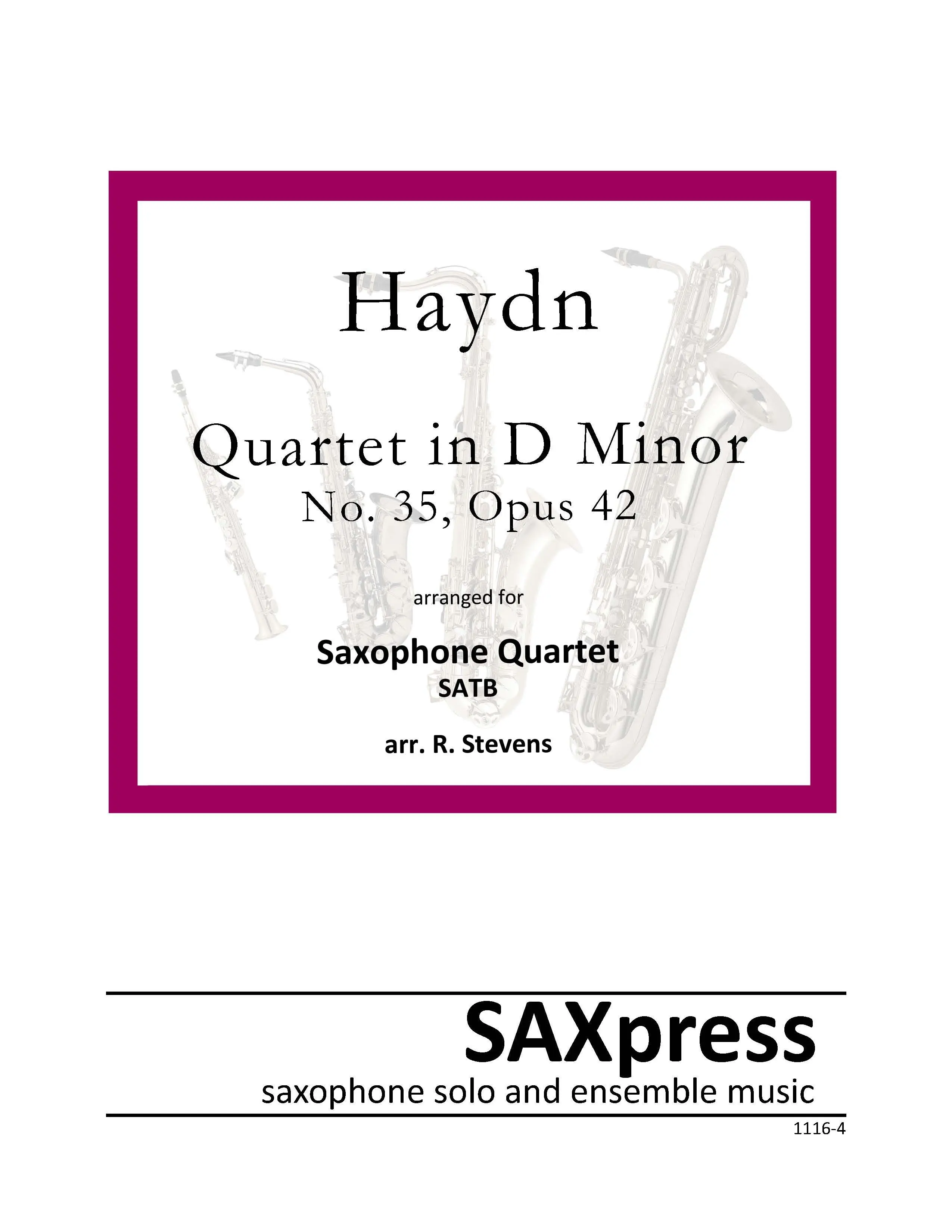 Quartet 35 in D minor, Op. 42, by Franz Joseph Haydn, string quartet transcription for SATB saxophone quartet. Haydn spent much of his career as a court musician for the wealthy Esterházy family on their remote estate. Isolated from other composers and trends in music until the later part of his long life, he was, as he put it, “forced to become original”. That originality is evident in the D minor Quartet, String Quartet 35 in D minor, Op. 42, H. 3/43