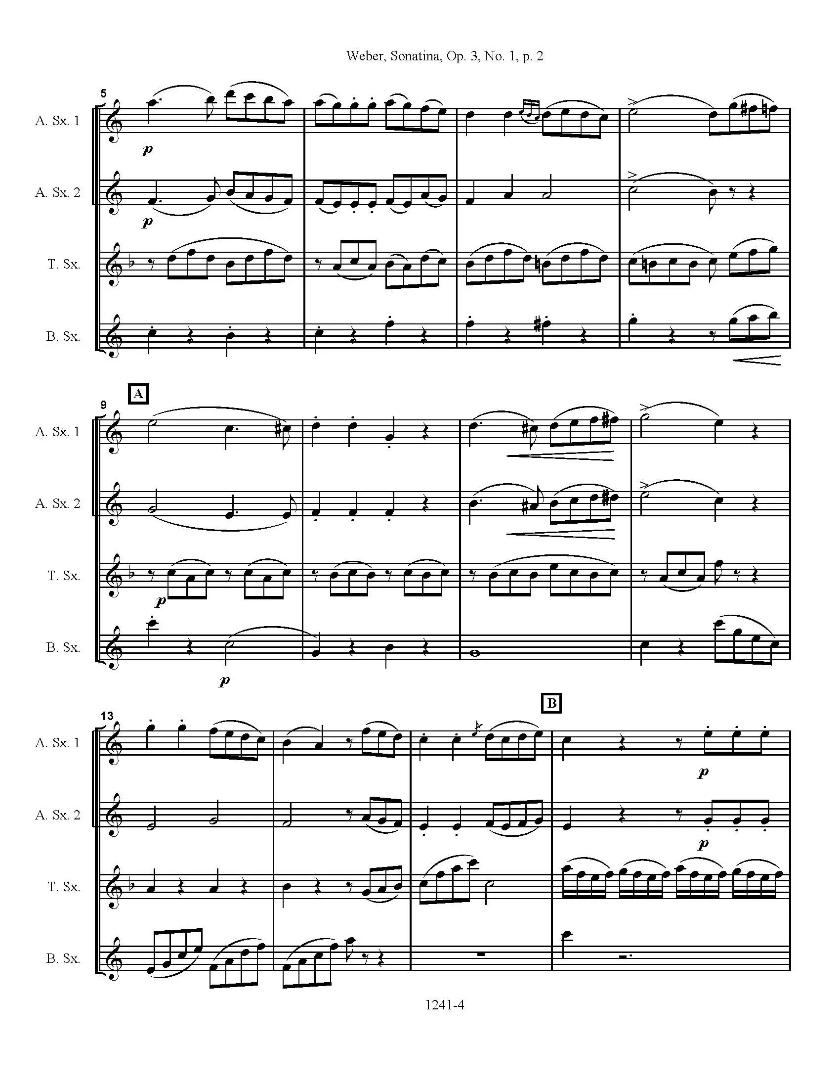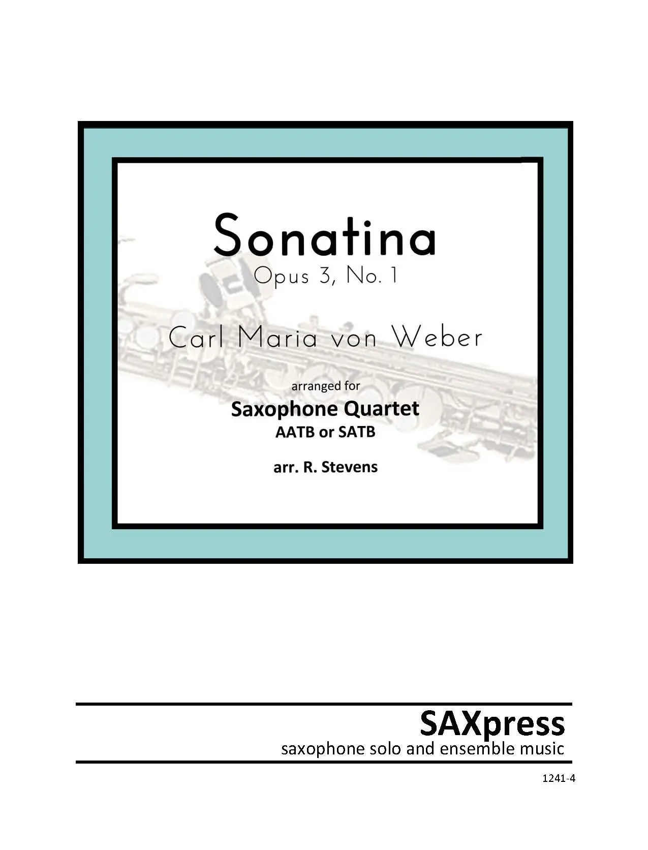 Sonatina, Op. 3 No. 1 by Carl Maria von Weber, arranged for saxophone quartet S/AATB. This sonatina is a good example of late classical/early romantic writing. Originally for piano four hands, the melodic and harmonic lines are clearly drawn and transfer to the saxophone quartet setting very well. The Alto 1 and 2 parts generally busy themselves with the melody while the tenor and bari are a little more interesting and full of scales, trills, and arpeggios. The transcription lowers the key from C major to E flat major. The Sonatina is scored for both SATB and AATB sax quartets.
