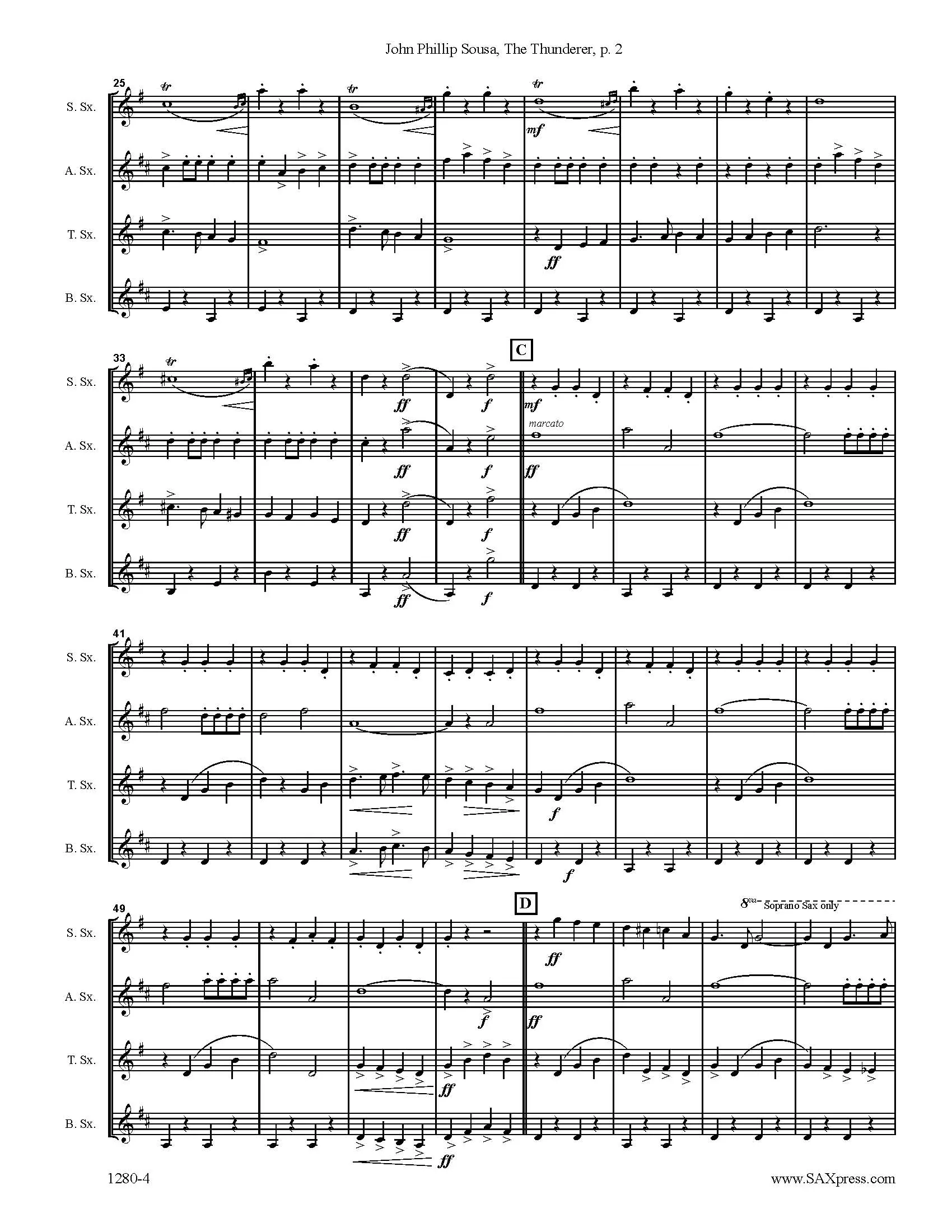 The Thunderer by Sousa, arranged for saxophone quartet S/AATB. This is a march written by John Philip Sousa in 1889. It is one of his most famous and often played marches. The Thunderer is a standard march played by all American military bands.