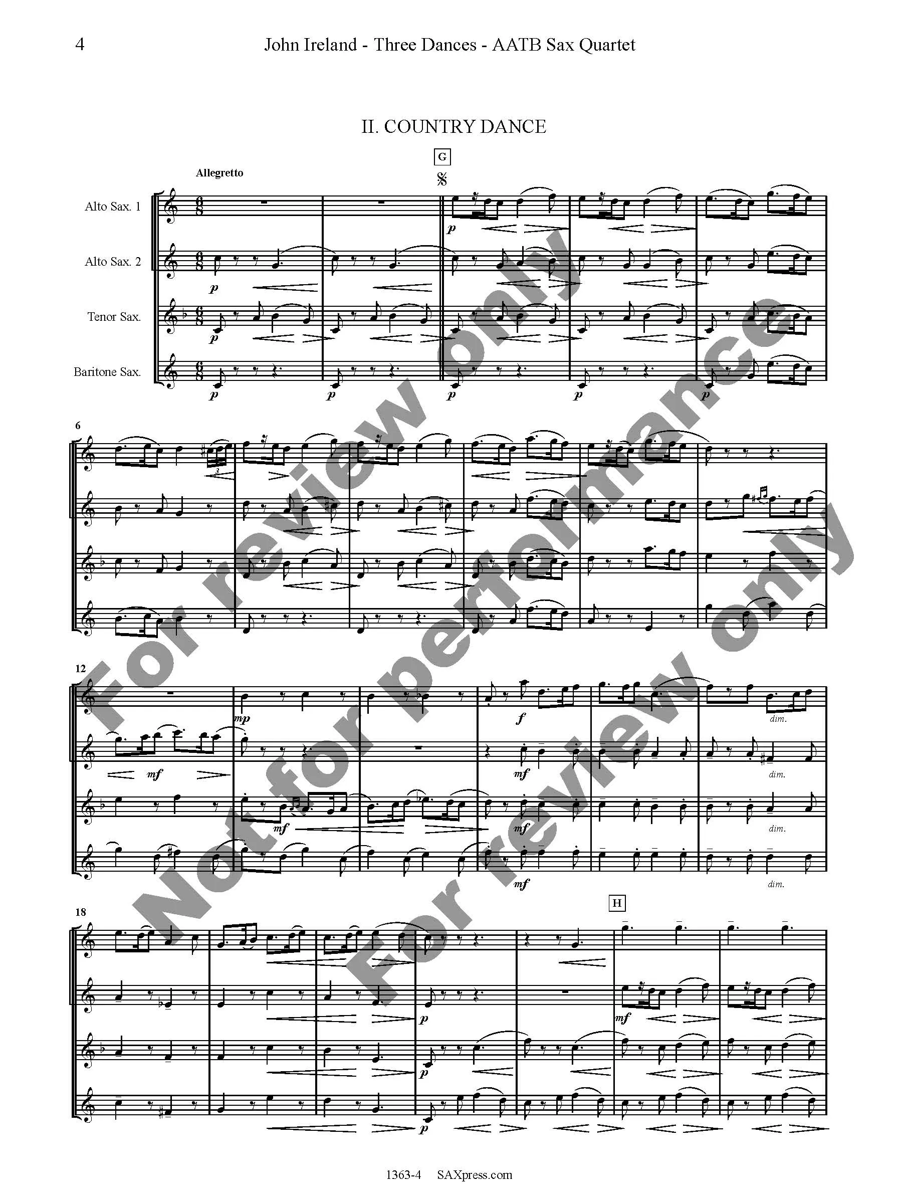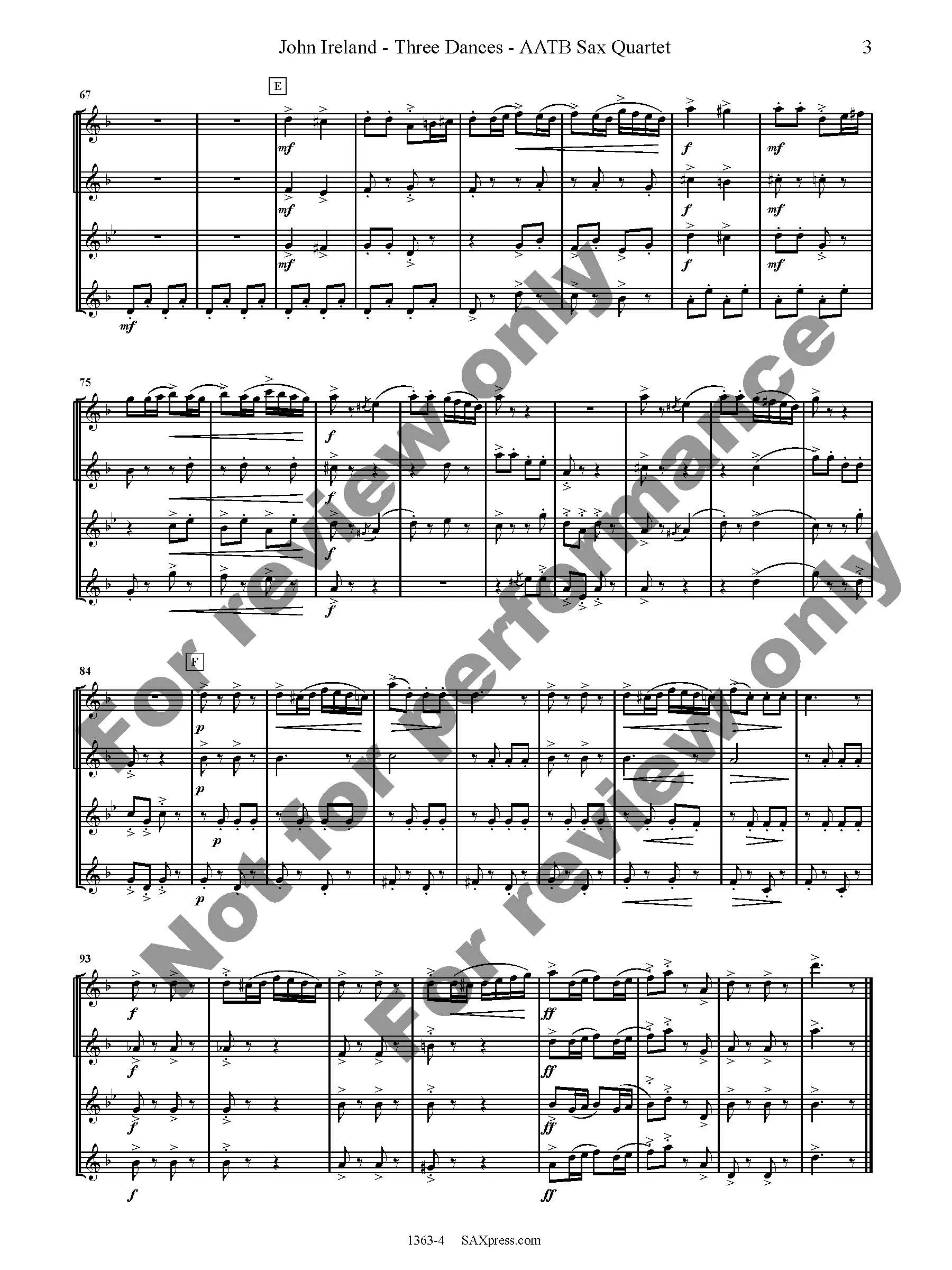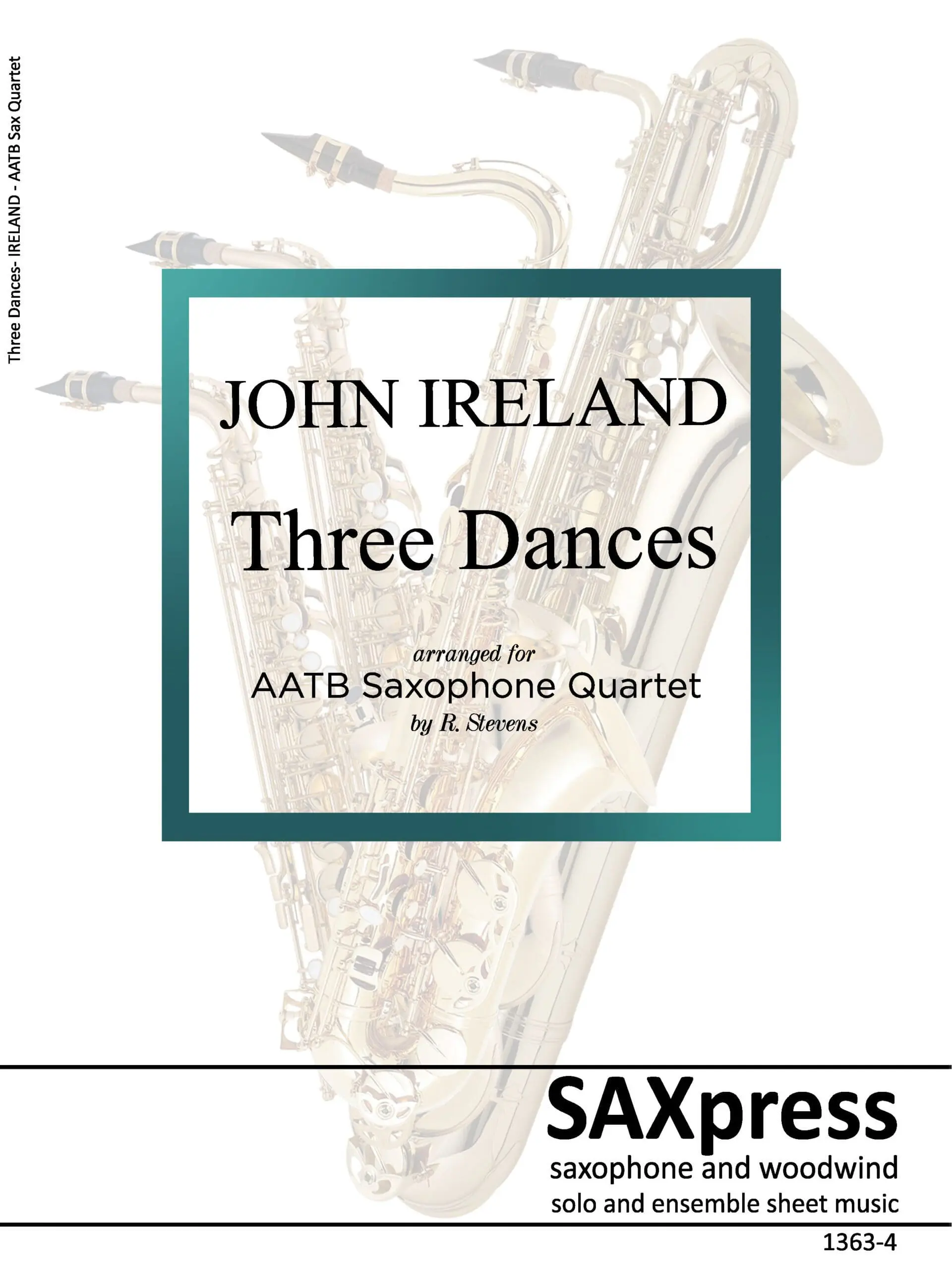 Three Dances by John Ireland arranged for AATB Saxophone Quartet. Originally written as a set of piano pieces, these short dances are full of character and energy. Each movement is written in its own distinct style. They can be programmed individually or played as a suite. The 3 movements of this work are: