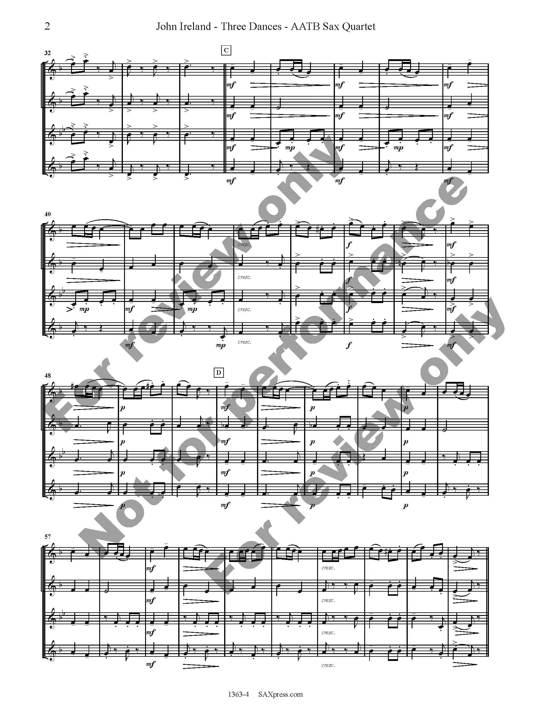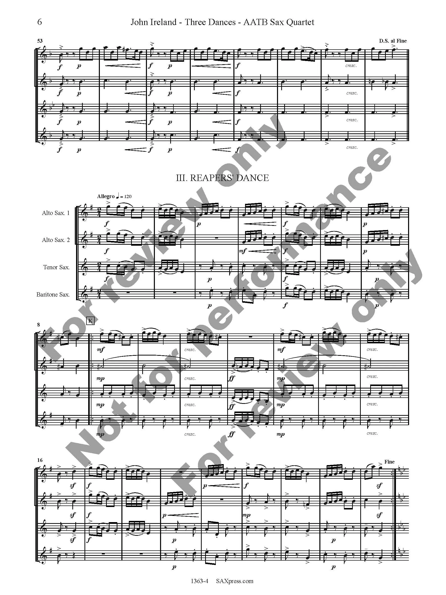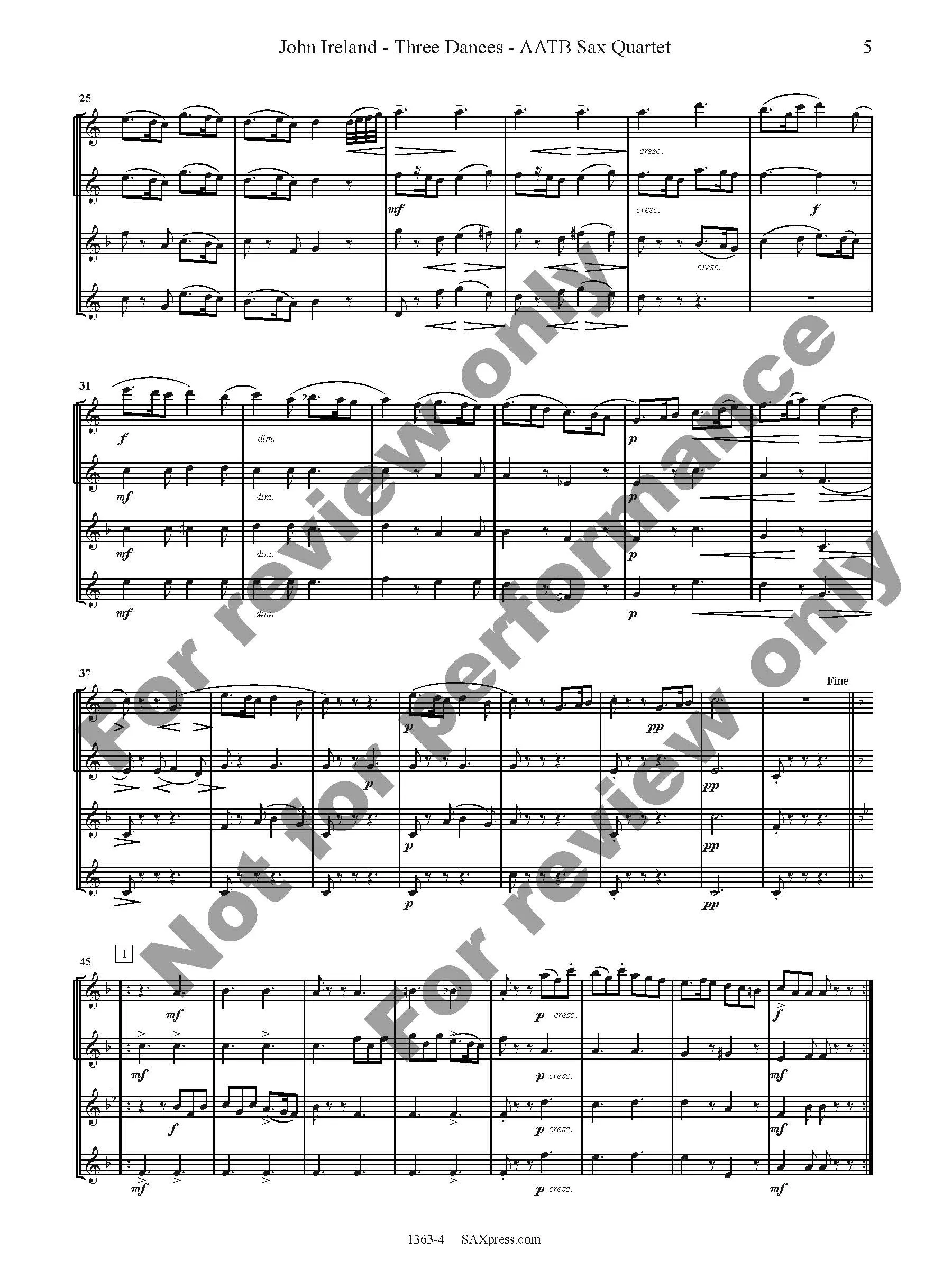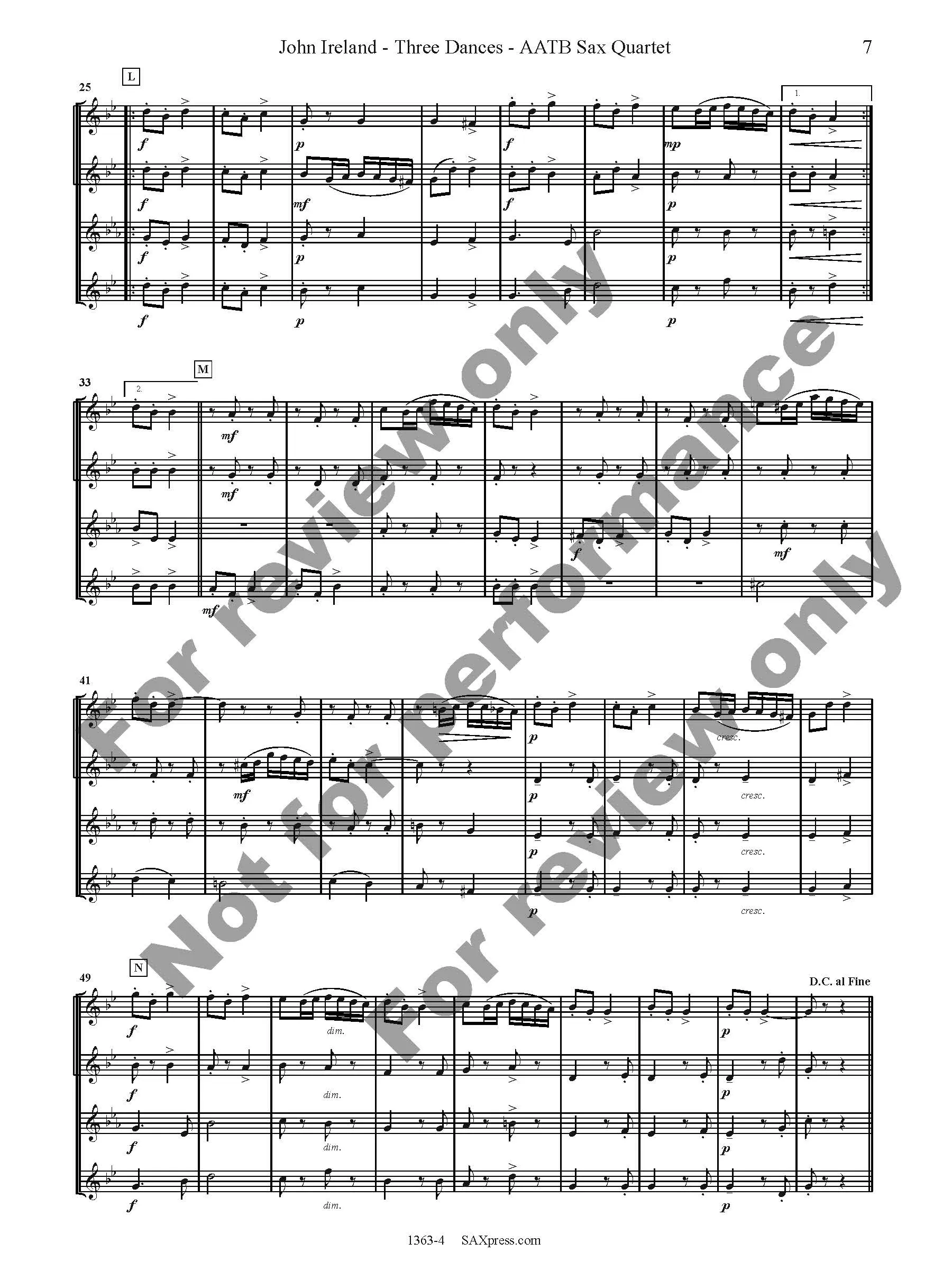 Three Dances by John Ireland arranged for AATB Saxophone Quartet. Originally written as a set of piano pieces, these short dances are full of character and energy. Each movement is written in its own distinct style. They can be programmed individually or played as a suite. The 3 movements of this work are: