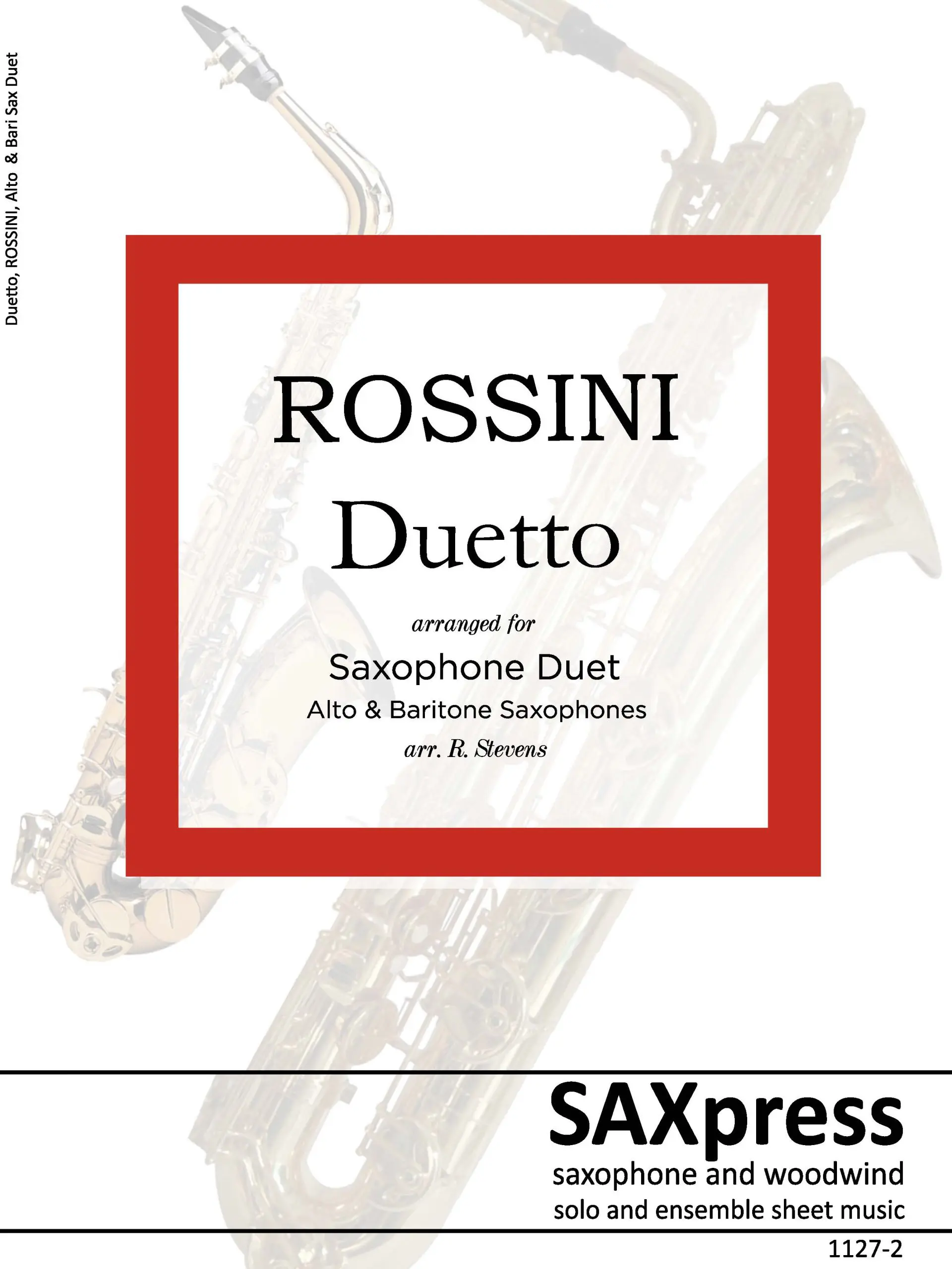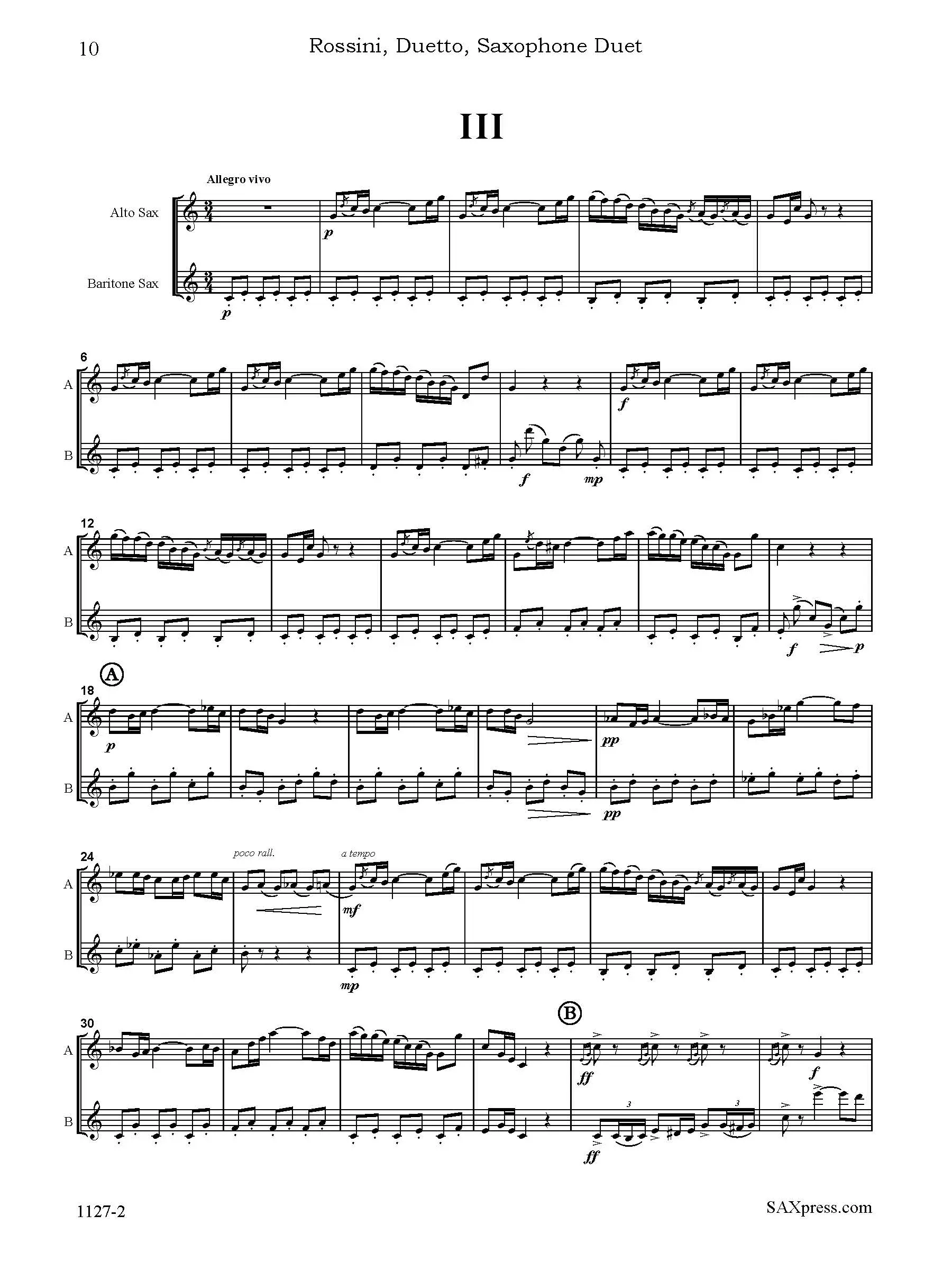 Duetto for Alto and Baritone Saxophone by Rossini, arranged for alto and baritone saxophone duet. The original version is for cello and double bass. From start to finish it is filled with the wit, lyricism, and melodic invention that made Rossini the leading opera composer of his time.