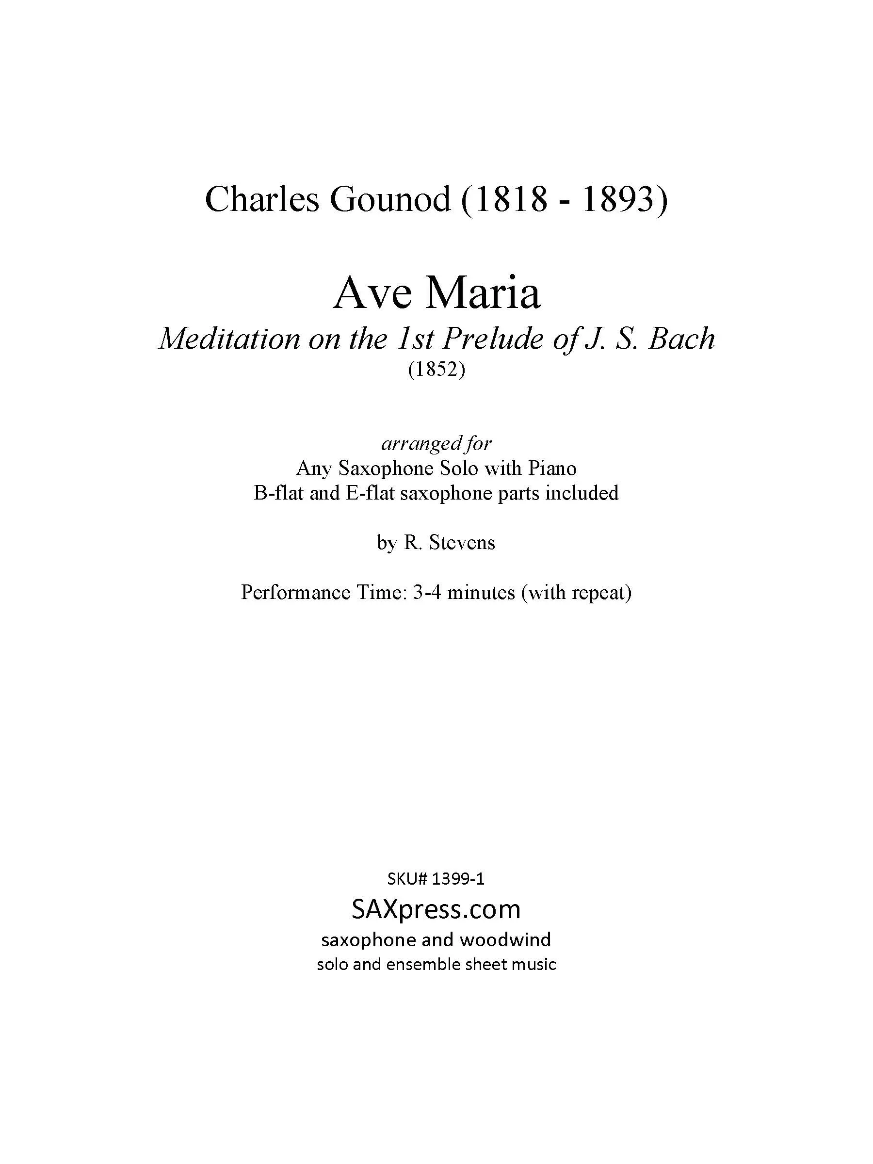 This arrangement of Ave Maria (Bach/Gounod) is based on the 1853 original publication. It is arranged for any saxophone solo with piano. It includes: