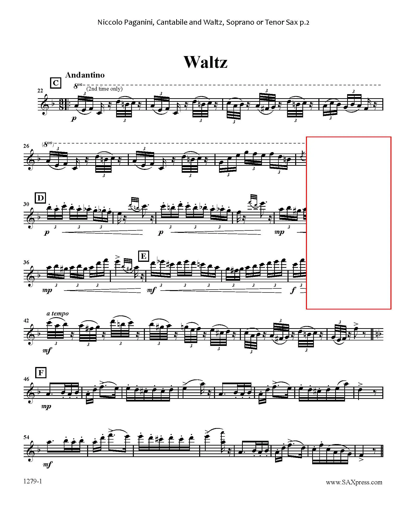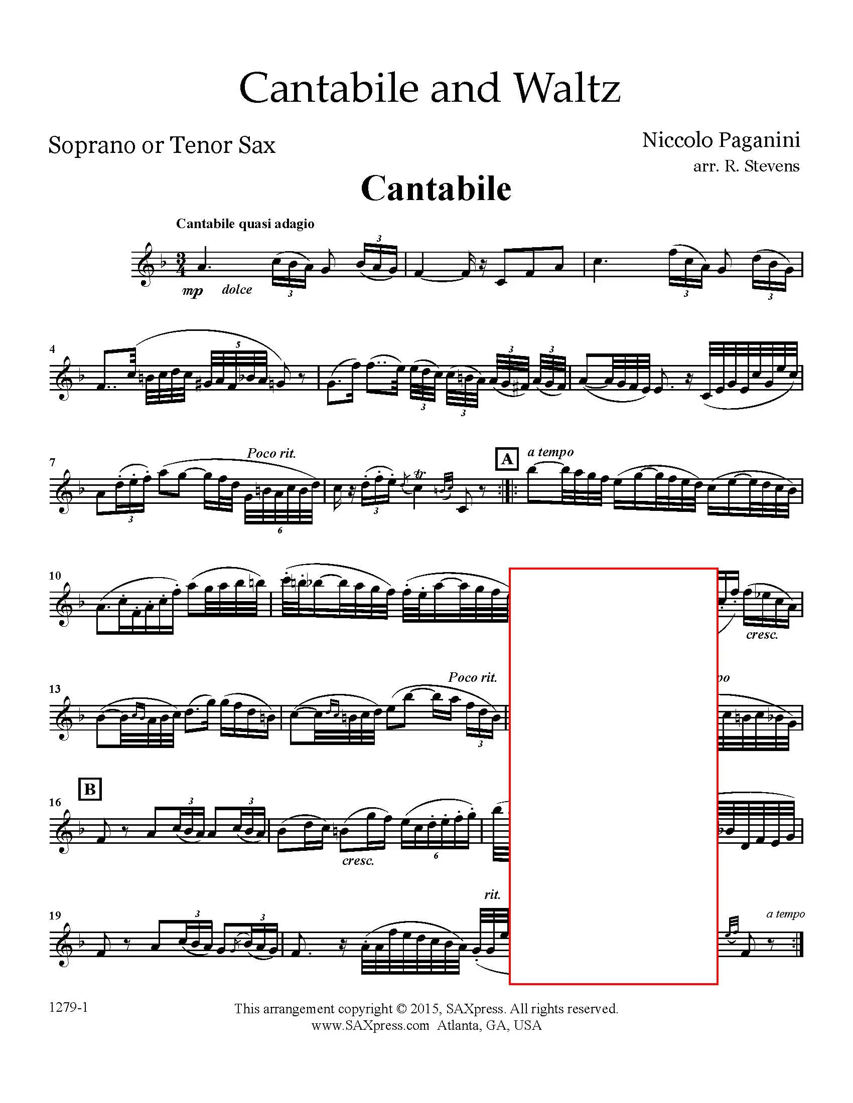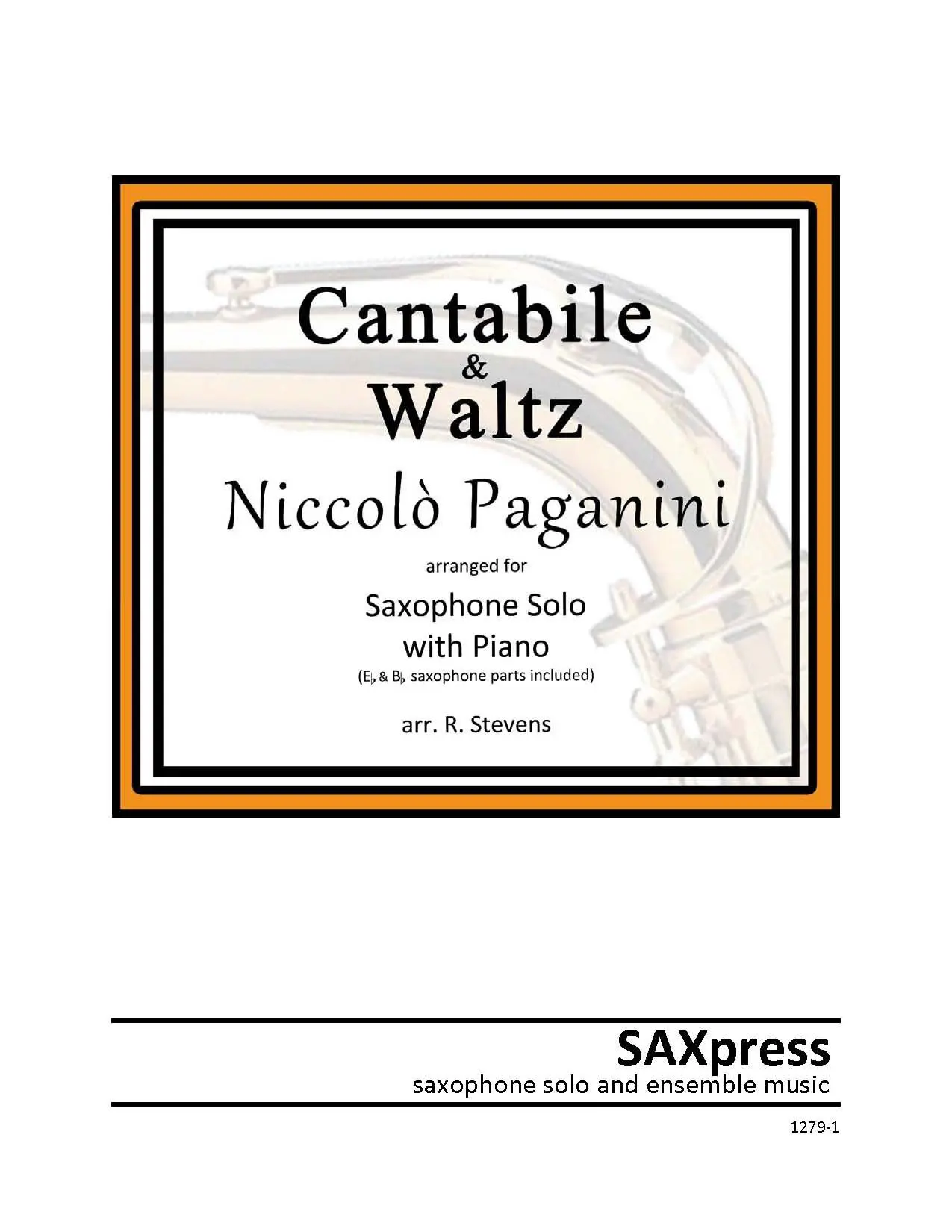 Cantabile and Waltz, Op. 19 by Paganini, arranged for Any Saxophone Solo. These are two lyrical pieces written by Niccolò Paganini for his only student – Camillo Sivori. Since it was composed for a student, it does not require the towering virtuosity that Paganini was famous for. It is difficult but playable. Like most of his violin works, they were not published during his lifetime.
