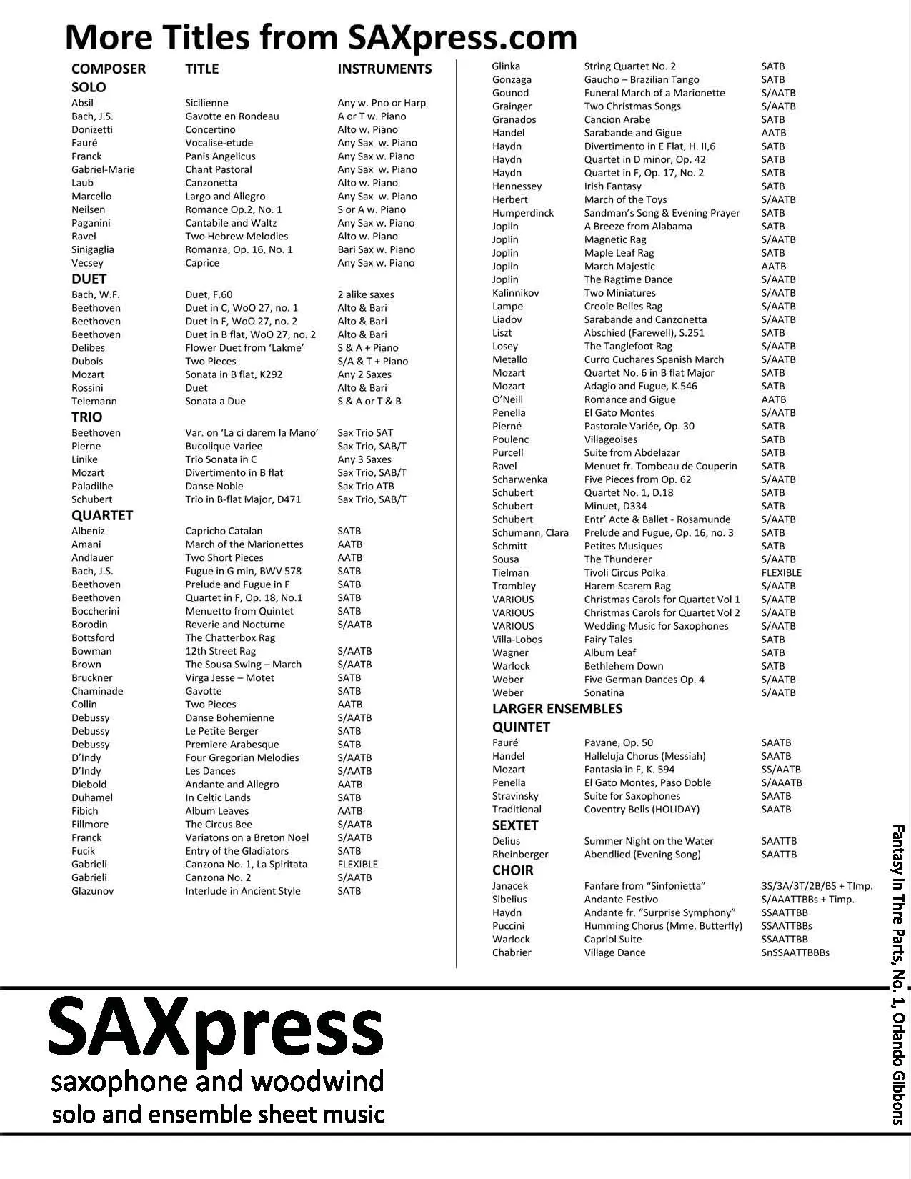 Fantasy in Three Parts by Orlando Gibbons, arranged for Saxophone Trio, Flexible Scoring. This Fantasy, the first of a set of nine was written in 1620. The original version was for three viols.