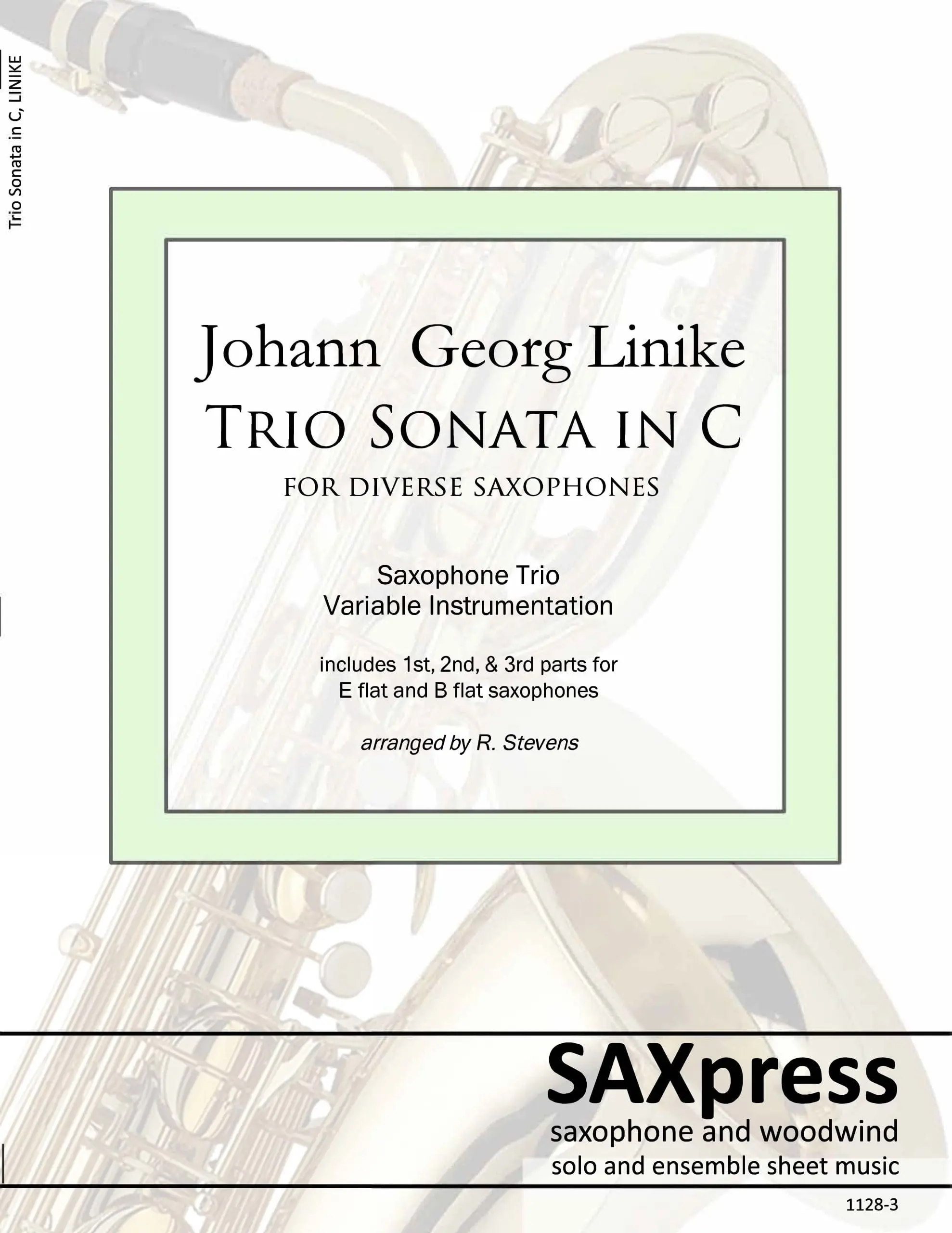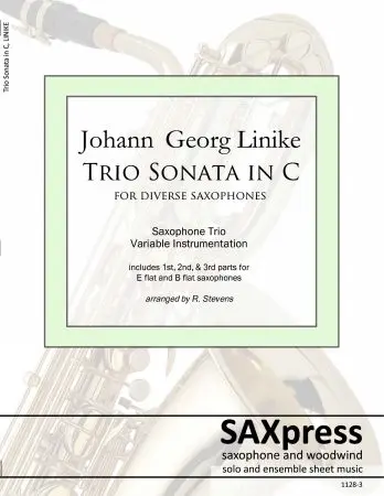 Trio Sonata in C by Johann Georg Linike, arranged for saxophone trio, is a pleasant little work by the mostly unknown German Baroque composer Johann Georg Linike. Although titled “Trio Sonata in C”, it does not follow the typical format of a baroque trio sonata. Each movement is quite short – think of it as a trio sonata in miniature. Together, all three movements take less than five minutes to perform. Regardless of its length it is well suited for saxophone trio.