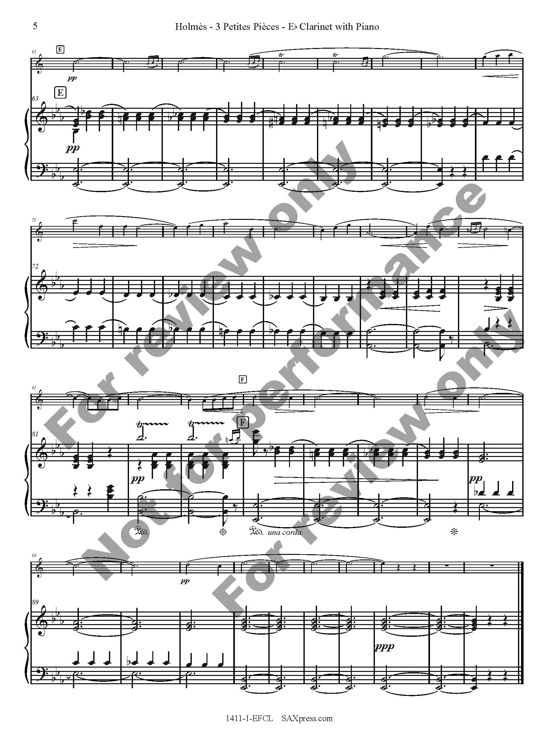 E flat Clarinet is for E flat Clarinet solo with Piano. The original key of all three movements has been retained. The first movement is in the key of D major, putting the clarinet part in B major; however, the piece is a little slow and it lays under the fingers well. Taken as a whole, the set of pieces is of moderate difficulty. Thanks to clear rhythms and well-written piano support, intermediate players should find success with this set.